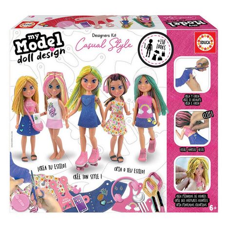 My Model, ta poupée, ton style ! Avec My Model, deviens styliste et crée des looks et coiffures incroyables pour ta poupée. Dans ce coffret tu as tout ce qu'il faut pour créer des tenues casual hyper tendance. Contient : 1 poupée articulée à assembler, 1 bande de tissu pré-imprimé, 23 accessoires de mode, 26 autocollants, des clips pour vêtements, 8 écheveaux de laine, 1 outil de perforation du tissu, instructions.