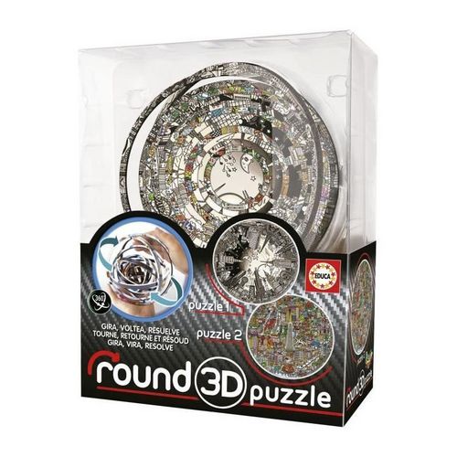 TOURNE, RETOURNE ET RÉSOUD. 2 puzzles en 1, avec 2 défis extraordinaires a 360º. A quelle vitesse peux-tu tourner, retourner et pivoter les anneaux pour compléter l'image ? Les Round 3D Puzzles comprennent deux puzzles un de chaque côté !