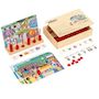 Recherchez des éléments de la bande d'affectation sur la feuille de thème. Pour chaque élément que vous trouvez, placez l'une des perles sur un bâton. Ensuite, retournez la bande d'attribution pour voir la bonne réponse, qui est représentée à la fois dans les points et les symboles numériques. L'exercice stimule le comptage non structuré et structuré et la compréhension du nombre jusqu'à 10. Par exemple, on peut trouver des quantités non structurées dans le zoo, où les animaux sont représentés dans leurs enclos. En revanche, des quantités structurées peuvent être vues dans le contexte d'un supermarché. L'ensemble contient 6 cartes à thème avec différents thèmes, dont le zoo, un supermarché, autour de la maison, à la plage, dans une ferme et dans un potager. Les exercices varient en difficulté. Autrement dit, il y a 2 cartes avec des quantités jusqu'à 6 et 4 cartes avec des quantités jusqu'à 10. En plus des compétences en mathématiques, les enfants forment également leurs compétences moteurs et langues fines. En fait, la mise en place des perles sur les bâtons stimule le développement de leur motricité. Les feuilles de thème sont reconnaissables pour les tout-petits et peuvent donc être utilisées comme points de discussion également. Essayez de discuter de ce qui peut être vu, par exemple en signalant des objets ou en partageant des histoires. Contenu:. 6 feuilles de thème en plastique. 6 bandes d'attribution en plastique. 100 perles en plastique. 2 supports en bois. Boîte en bois (33,5 x 22,5 x 7 cm)