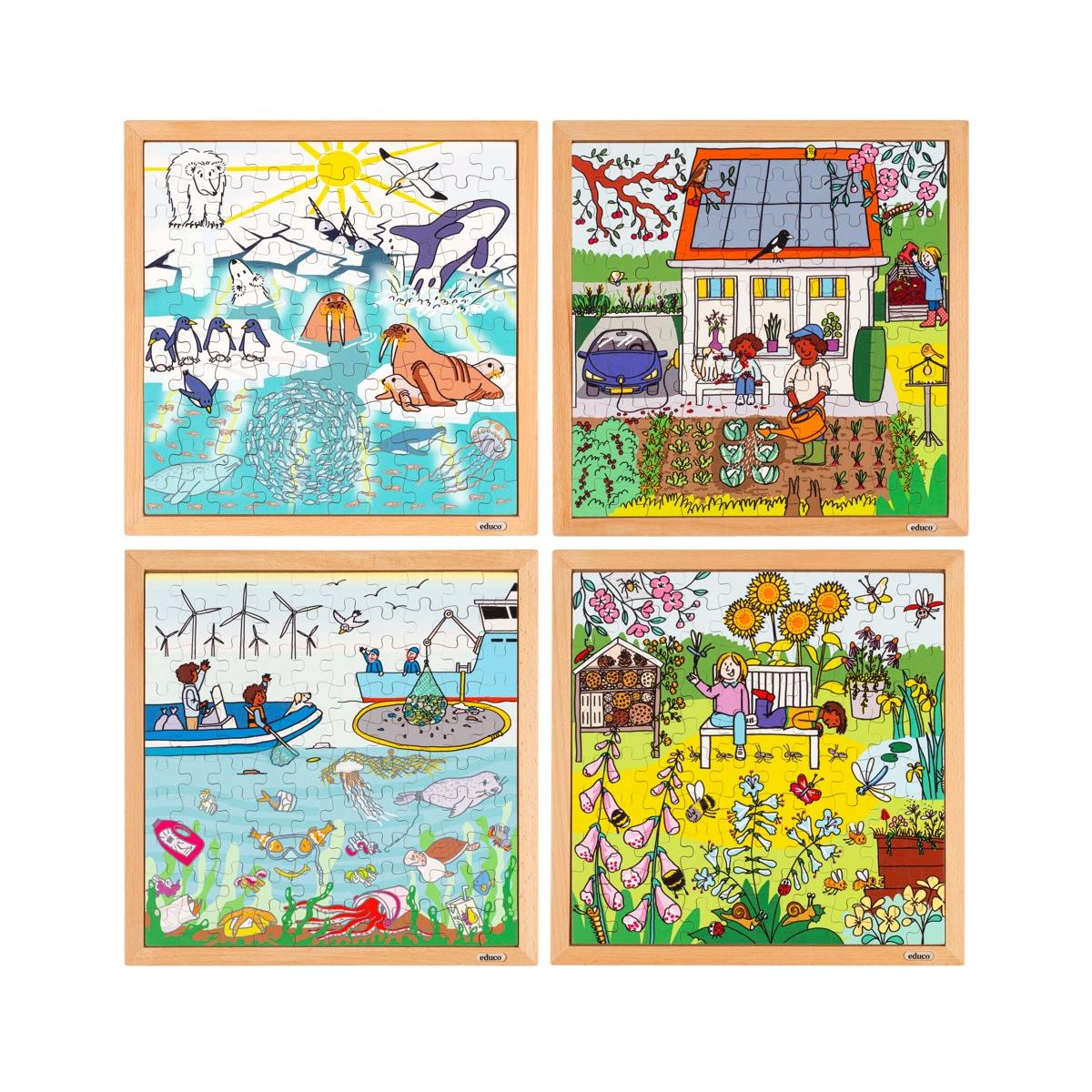 Contenu:. Un ensemble de 4 puzzles Nature et Climate:. Maison durable (100 pièces). Réchauffement climatique (100 pièces). Zoo de soupe en plastique (100 morceaux). Jardin pour insectes (100 pièces)