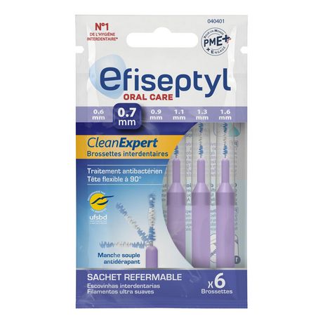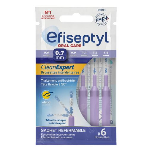 La brossette interdentaire Efiseptyl Clean Expert est : Performante : L'alternance de ses brins courts et longs permet une adaptation optimale à tous les reliefs interdentaires, pour un nettoyage plus efficace qu'avec une brossette classique. Hygiénique : Ses brins imprégnés d'agent antibactérien (silver zeolite), son capuchon et leur sachet refermable garantissent une meilleure hygiène. Ergonomique : Son manche flexible et antidérapant permet une parfaite prise en main et facilite l'accès aux dents du fond.