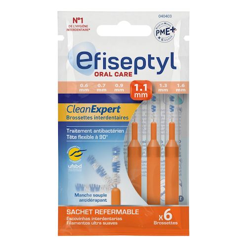 La brossette interdentaire Efiseptyl Clean Expert est : Performante : L'alternance de ses brins courts et longs permet une adaptation optimale à tous les reliefs interdentaires, pour un nettoyage plus efficace qu'avec une brossette classique. Hygiénique : Ses brins imprégnés d'agent antibactérien (silver zeolite), son capuchon et leur sachet refermable garantissent une meilleure hygiène. Ergonomique : Son manche flexible et antidérapant permet une parfaite prise en main et facilite l'accès aux dents du fond.