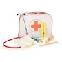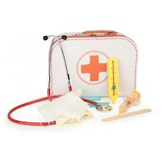 La valisette docteur contient tout ce qui est nécessaire pour jouer au docteur et à l'infirmière. Un vrai stéthoscope qui permet d'entendre les petits c?urs battre ! un joli thermomètre en bois, une seringue, deux gants, une charlotte et un bâtonnet pour faire tirer la langue aux copains ! Elle est