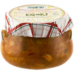 Morue, pomme de terre, tomate, poivron rouge, poivron vert, oignon, huile de tournesol, piment d'Espelette AOP, ail.