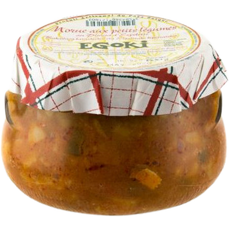 Plat cuisiné en cassolette en verre à base de morue et de légumes relevé d'une pointe de piment d'Espelette.