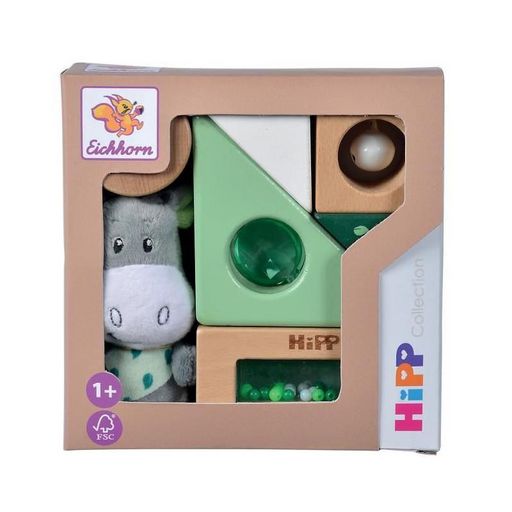 Jeu d'éveil sonore en bois HIPP. Le jeu se compose de 7 blocs de bois de formes variées avec différents sons et d'une peluche du petit âne. A partir d'1 an. Bois de hetre 100% FSC.