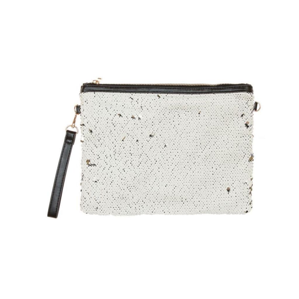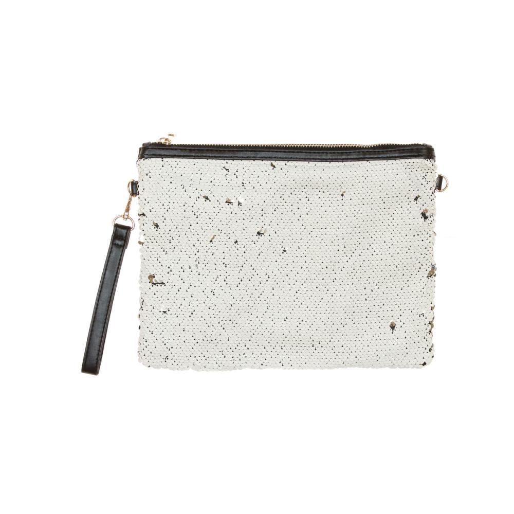 Optez pour la pochette femme de la marque Eight2nine Pochette avec sequins Coloris : Blanc/Doré Fermeture zippée Chaîne amovible Dim : 27.5x21 cm
