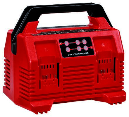 Avec le chargeur Power X-Quattrocharger 4 A 2x2 Einhell, rechargez encore plus rapidement 4 batteries Power X-Change. Une batterie pour tous les appareils : Les batteries Power X-Change sont compatibles avec tous les outils de bricolage et de jardinage de la puissante gamme Einhell du même nom. Ce chargeur universel peut être utilisé pour toutes les batteries Power X-Change. Les bénéfices pour le client sont évidents : Le système universel de batteries et chargeurs compatibles avec tous les appareils permet de réaliser des économies importantes à l&rsquo,achat, de préserver l&rsquo,environnement et de gagner en flexibilité pour les travaux dans la maison et au jardin. Le chargement simultané de deux batteries (1 batterie de chaque côté) économise de la place et assure un chargement rapide et une grande disponibilité des batteries sans devoir interrompre les travaux. Une fois que deux batteries (1 de chaque côté) sont entièrement chargées, le chargement des deux suivantes démarre automatiquement. La poignée intégrée permet de transporter 4 batteries simplement et sans effort. Grâce à son faible poids, le Quattrocharger est idéal pour une utilisation mobile. L&rsquo,appareil comprend quatre emplacements pour batterie qui sont reliés au même connecteur, offrant ainsi un gain de place, aussi bien à l&rsquo,établi que sur le chantier. La technologie de charge rapide réduit encore les temps de charge, et le système de gestion de charge intelligent contrôle la batterie en continu pour un processus de charge optimal et une sécurité maximale. Le mode Refresh permet de réactiver les batteries en état de décharge profonde. L&rsquo,indicateur LED à 6 positions permet de suivre l&rsquo,état de chaque batterie.