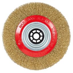 Le disque-brosse Original Einhell est un accessoire de touret à meuler très pratique. Il s&rsquo,utilise pour décaper, limer, nettoyer ou éliminer les vieux restes de peinture et convient particulièrement au traitement d&rsquo,éléments résistants en fonte de type limes, boulons ou filetages, ainsi qu&rsquo,au ponçage du bois. Le disque-brosse est un accessoire très pratique conçu spécialement pour le touret à meuler TC-BG 150 B Einhell. Composé de fils métalliques en acier robuste, il présente un diamètre de 150 mm et un alésage central de 12,7. Il ne peut être utilisé que jusqu&rsquo,à un régime de 6 000 tours par minute.