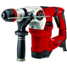 Le marteau perforateur TE-RH 32 4F Kit Einhell est un outil puissant de 1 250 W avec 4 fonctions de base pour réaliser des travaux de réfection et de rénovation : perçage, perforage et burinage avec ou sans fixation du burin. Les marteaux perforateurs s&rsquo,utilisent dans des conditions exigeantes, pour marteler et percer des matériaux particulièrement solides et résistants comme la pierre et le béton. Les impulsions de frappe fragilisent complètement le matériau, qui est ensuite attaqué par la lame de l&rsquo,outil sous l&rsquo,effet du mouvement de rotation et finit par se briser. Les marteaux perforateurs sont également employés pour buriner, démolir ou casser des matériaux durs comme le béton, la brique ou la pierre. Le marteau perforateur exerce une force de frappe jusqu&rsquo,à 5 J sur l&rsquo,outil, et son mécanisme de frappe pneumatique assure une avancée optimale pour une performance de perçage de 32 mm maximum dans le béton. La tête d&rsquo,engrenage robuste en aluminium augmente la résistance et la longévité du marteau perforateur, les deux LED indiquant l'état de l&rsquo,outil : «, opérationnel », ou «, entretien nécessaire », en cas d&rsquo,usure des balais. La fonction Press-Control affiche la pression de contact optimale. Les grandes surfaces Softgrip et la poignée auxiliaire solidement fixée par rainurage assurent une prise en main ferme et une manipulation sûre. La poignée anti-vibration permet une utilisation avec un minimum de vibrations. De plus, l&rsquo,accouplement à glissement prévient la surcharge et garantit une sécurité accrue de l&rsquo,utilisateur. Le marteau perforateur est équipé d&rsquo,un mandrin SDS Plus semi-automatique universel et robuste. Le variateur électronique permet d&rsquo,adapter la puissance de l'outil aux matériaux et aux utilisations. La butée de profondeur réglable en continu est en métal massif. L&rsquo,outil est vendu avec 3 forets (Ø, 8, 10 et 12 mm), un pointeau et un burin plat dans le coffret de transport et de rangement E-Box.