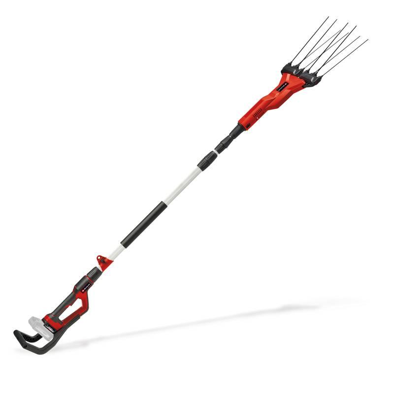 Le secoueur d&rsquo,olives/de fruits sans fil GE-FS 18/53 Li-Solo Einhell fait tomber fruits et olives grâce à la puissance d&rsquo,une batterie. L&rsquo,appareil fait partie de la gamme combinable Power X-Change. Avec ses 8 dents en carbone, le râteau collecteur opère un mouvement latéral constant à une vitesse réglable. Les dents se remplacent facilement. La longueur totale de l&rsquo,appareil s&rsquo,adapte entre 220 et 310 cm grâce à une fonction télescopique. La poignée auxiliaire arrière, la fonction de marche continue, les surfaces Softgrip spéciales et la sangle de transport réglable assurent une manipulation confortable. Un support mural est inclus de série pour ranger l&rsquo,appareil sans encombrement. Appareil vendu sans batterie ni chargeur Cueilleur d'olives et de fruits sans fil