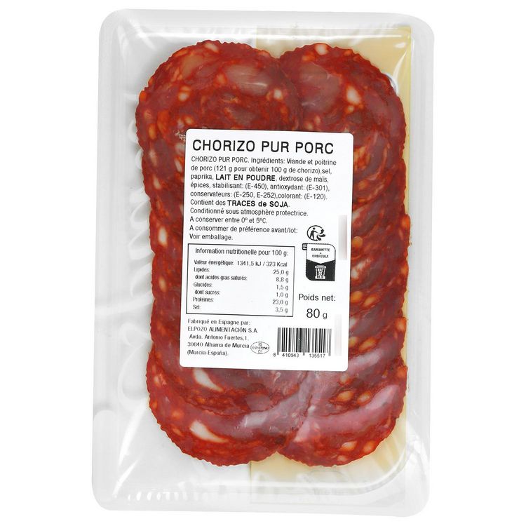 Ingrédients : Viande et poitrine de porc (121 g pour obtenir 100 g de chorizo), sel, paprika, LAIT EN POUDRE, dextrose de maïs, épices, stabilisants: (E-450), antioxydant: (E-301), Conservateurs: (E-250, E-252), colorant: (E-120). Contient des TRACES de SOJA