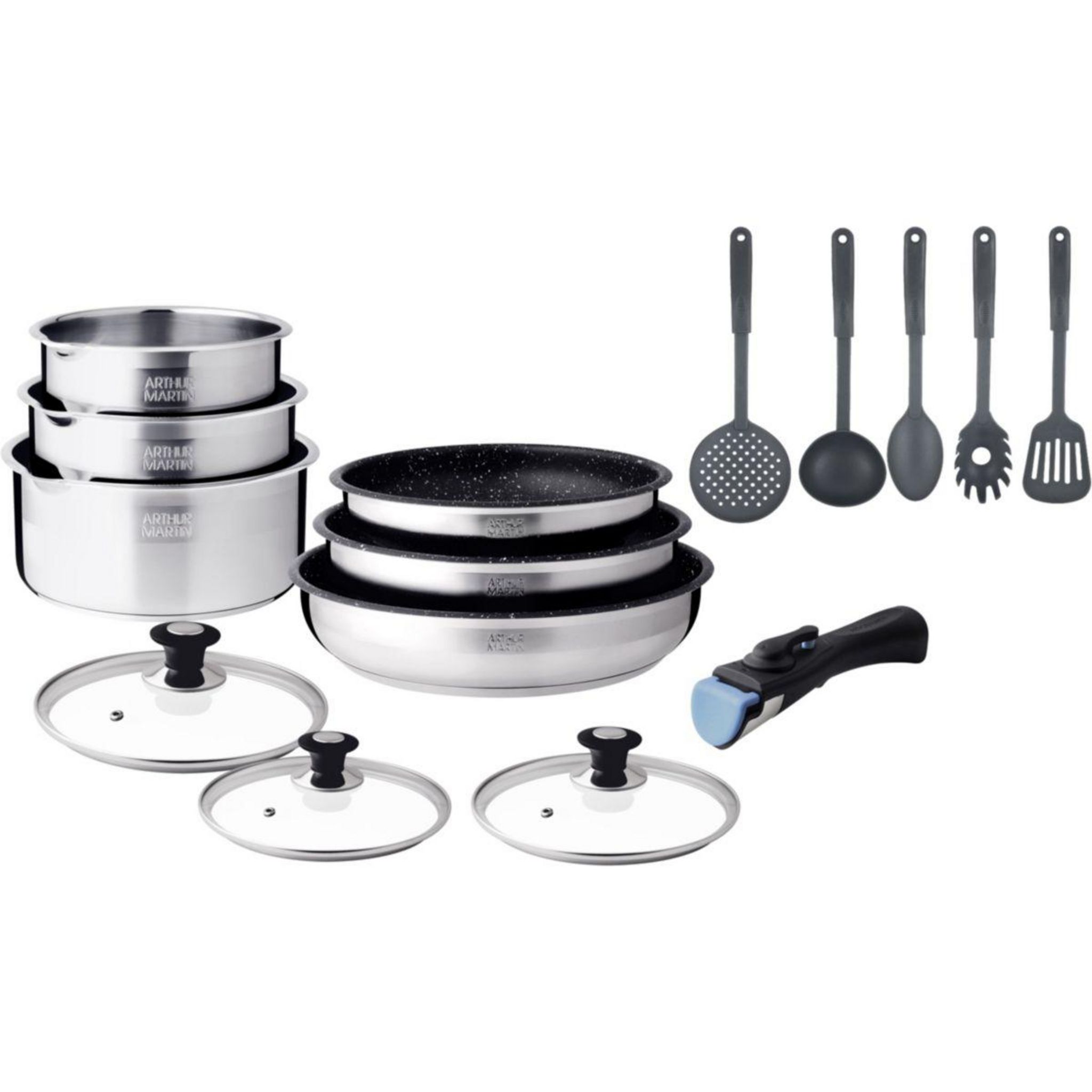 | Contenu du set | 3 casseroles 16-18-20 cm - 3 poêles 20-22-26 cm anti adhérent - 3 couvercles 16-18-20 cm - 5 ustensiles - 1 poignée | |