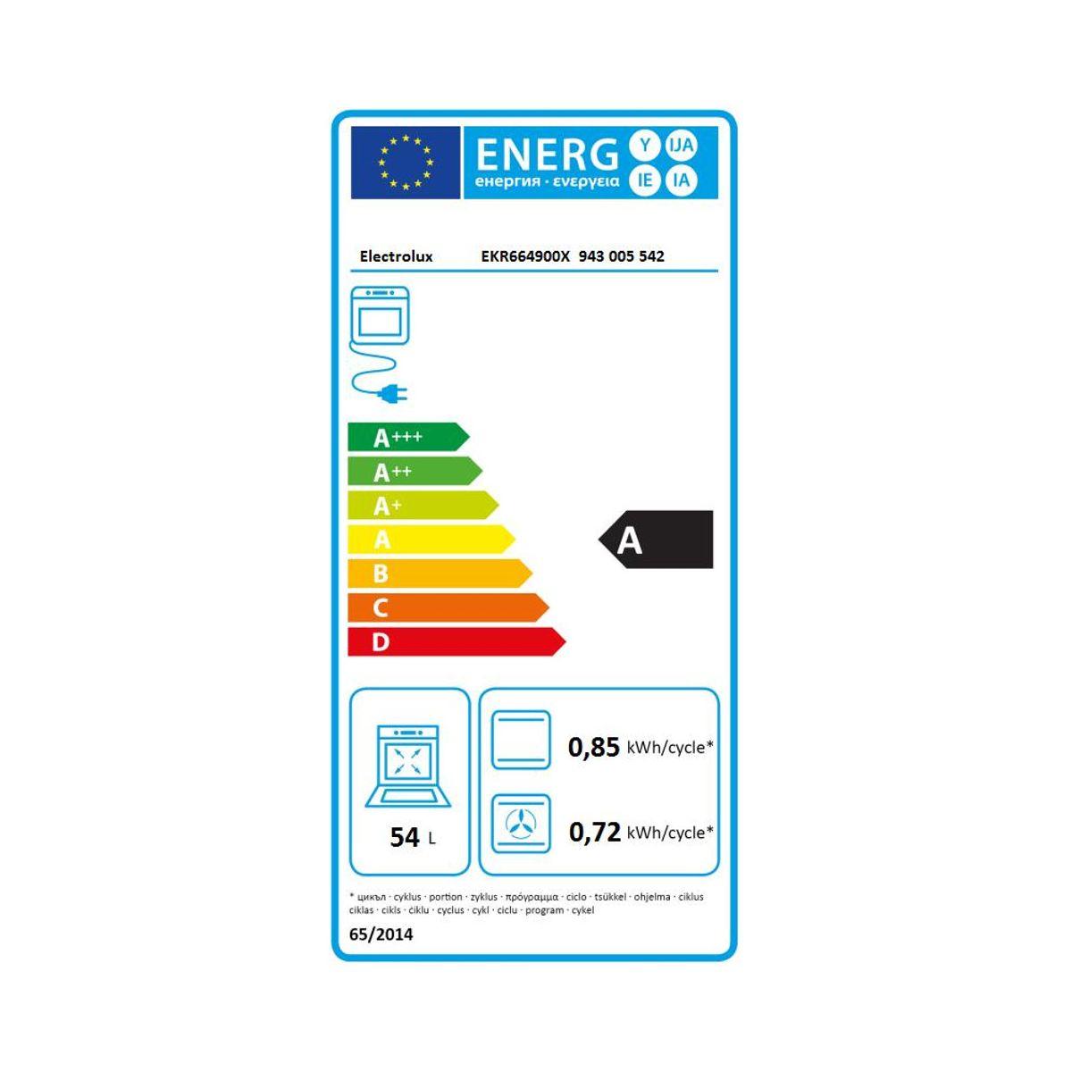 | Valeurs du label énergie | Label énergie A, Consommation en convection naturelle 0,85 kW, Consommation en chaleur tournante 0,72 kW | |