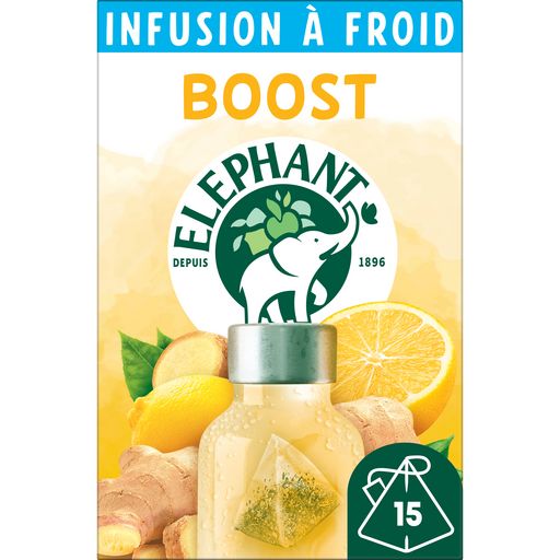 Avec les 15 Sachets Pyramid® de l'infusion à Froid Boost Citron Gingembre Eléphant, parfumez votre eau naturellement et offrez-vous un délicieux et rafraichissant moment de bien-être ! Avec cet infuse à froid Boost, donnez-vous un petit coup de fouet et découvrez l'association du citron, au goût acidulé et rafraichissant, et de la racine de gingembre, aux notes épicées, reconnue pour contribuer à la vitalité. En sélectionnant 100% d'ingrédients d'origine naturelle qui libèrent toutes leurs saveurs même dans l'eau froide, Eléphant vous invite à profiter d'un coup de fraîcheur fruitée à tout moment de la journée. C'est notre façon à nous d'infuser joie et bonne humeur. Les recettes Eléphant Infusion à froid sont uniquement composées de plantes, de fruits et d'arômes naturels. Elles sont sans sucres, sans calories et sans caféine. Eléphant a sélectionné pour vous le meilleur de plantes. Pour une dégustation idéale, laissez infuser le sachet d'infusion Pyramid® 5 minutes dans 500 ml d'eau froide, agitez et dégustez ! Parce qu'on aime notre planète, fini le petit film plastique. Quant à nos boîtes, elles sont recyclables et faites d'un carton issu de forêts gérées durablement. L'emballage intérieur est fabriqué à partir de pâte de bois compostable à la maison. Et nos sachets ? Pour emballer tout le monde, ils sont d'origine végétale et sans enveloppe. L'aventure Eléphant commence en 1896 et se poursuit encore aujourd'hui. Ce qui, de mémoire d'éléphant, fait une sacrée expérience pour un créateur d'infusions... Son plus grand plaisir, depuis toujours, est d'agiter nos papilles ! Eléphant fait de l'écoute de la nature une vraie force, qu'il utilise pour choisir le meilleur des plantes et des fruits et concocter de délicieuses infusions uniques et appréciées de tous. Mais ne vous y trompez pas, Eléphant*, marque préférée des Français, dans sa grande générosité, y ajoute aussi bienveillance, simplicité, une pointe d'humour et un brin d'originalité. Alors, rejoignez la tribu et découvrez toutes les autres délicieuses recettes de notre gamme Infusion à froid. *Eléphant, leader valeur & volume en France — Nielsen année 2022