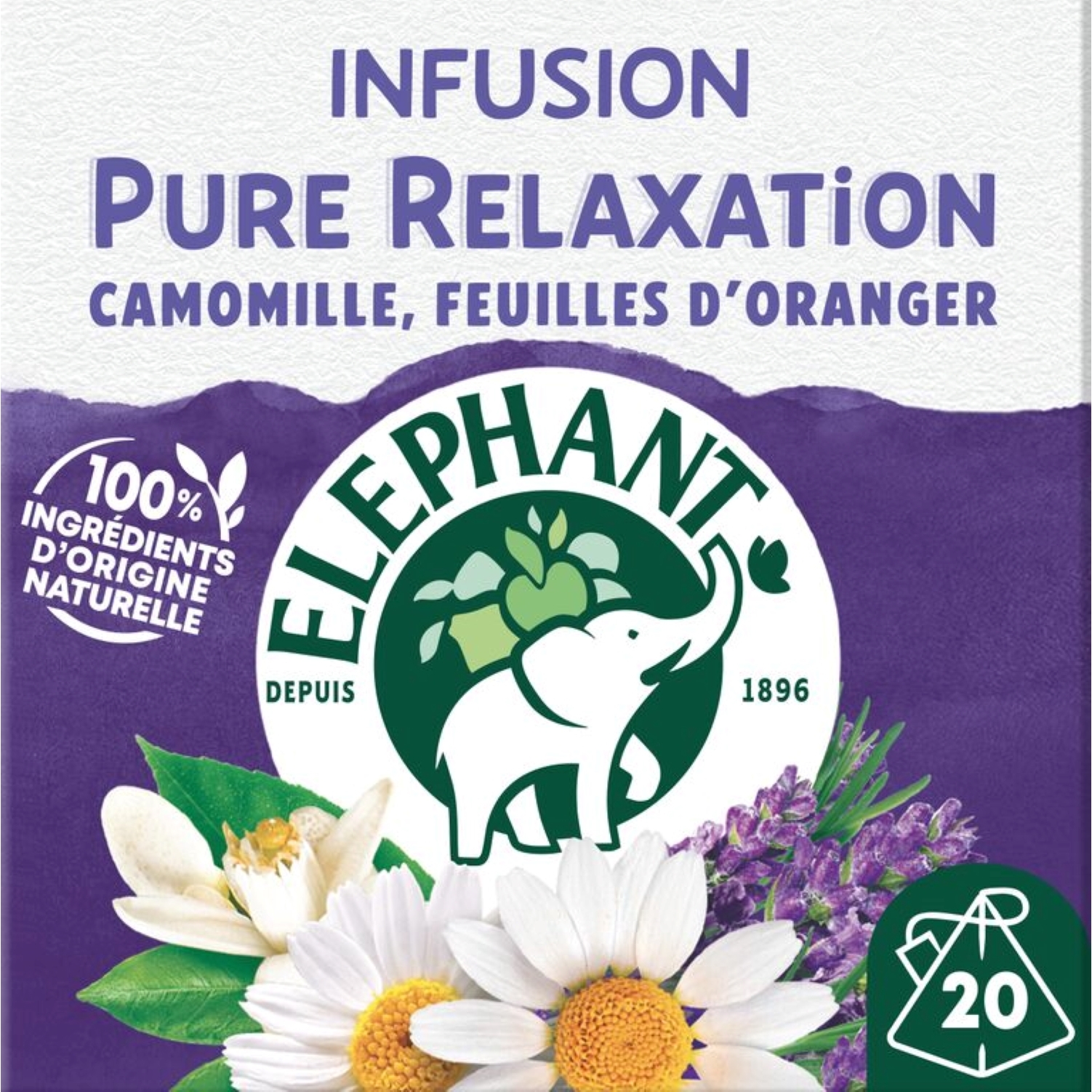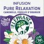 Avec l'infusion Pure Relaxation et ses 20 Sachets Pyramid®, restez zen et savourez le parfait équilibre entre la douceur de la camomille, le parfum des feuilles d'oranger, reconnues pour leurs propriétés relaxantes, et les notes très florales de la lavande. En sélectionnant des herbes certifiées Rainforest Alliance, Eléphant veut prendre soin de la planète et contribuer chaque jour à un monde meilleur pour l'humain et la nature. C'est notre façon à nous d'infuser joie et bonne humeur. Le secret de notre infusion ? 100% de ses ingrédients sont d'origine naturelle. Rien que pour vous, Eléphant a soigneusement sélectionné des plantes pour vous proposer cette gamme Bien-Etre. Pour une dégustation idéale, laissez infuser votre sachet d'infusion Pyramid® 4-5 minutes dans 200 ml d'eau chaude et dégustez. L'aventure Eléphant commence en 1896 et se poursuit encore aujourd'hui. Ce qui, de mémoire d'éléphant, fait une sacrée expérience pour un créateur d'infusions... Son plus grand plaisir, depuis toujours, est d'agiter nos papilles ! Eléphant fait de l'écoute de la nature une vraie force, qu'il utilise pour choisir le meilleur des plantes et concocter de délicieuses infusions uniques et appréciées de tous. Mais ne vous y trompez pas, Eléphant*, marque préférée des Français, dans sa grande générosité, y ajoute aussi bienveillance, simplicité, une pointe d'humour et un brin d'originalité. Alors, rejoignez la tribu et découvrez toutes les autres délicieuses recettes de notre gamme Bien-Etre. *Eléphant, leader valeur & volume en France — Nielsen année 2022