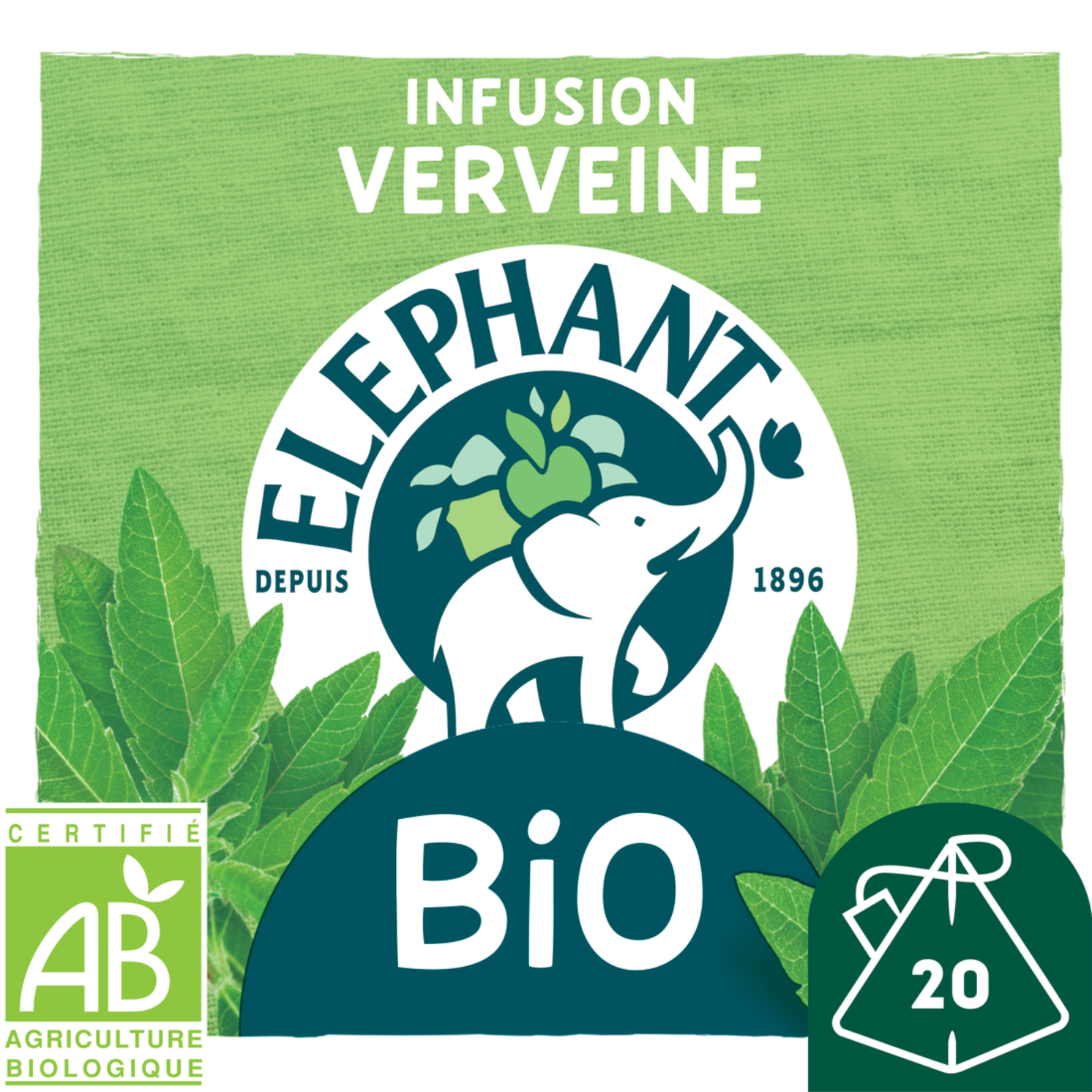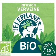Faites le plein de nature et retrouvez toute la richesse aromatique de la verveine et de ses notes délicatement citronnées grâce à l'infusion Bio Verveine et ses 20 Sachets Pyramid®. Cette infusion vous invite à savourer naturellement un grand moment de simplicité. C'est notre façon à nous d'infuser joie et bonne humeur. Le secret de notre infusion ? 100% de ses ingrédients sont d'origine naturelle. Rien que pour vous, Eléphant a soigneusement sélectionné des plantes issues de l'agriculture biologique pour vous proposer cette gamme Bio, pleine de goût. Pour une dégustation idéale, laissez infuser votre sachet d'infusion Pyramid® 4-5 minutes dans 200 ml d'eau chaude et dégustez. L'aventure Eléphant commence en 1896 et se poursuit encore aujourd'hui. Ce qui, de mémoire d'éléphant, fait une sacrée expérience pour un créateur d'infusions... Son plus grand plaisir, depuis toujours, est d'agiter nos papilles ! Eléphant fait de l'écoute de la nature une vraie force, qu'il utilise pour choisir le meilleur des plantes, des fruits et des épices et concocter de délicieuses infusions uniques et appréciées de tous. Mais ne vous y trompez pas, Eléphant*, marque préférée des Français, dans sa grande générosité, y ajoute aussi bienveillance, simplicité, une pointe d'humour et un brin d'originalité. Alors, rejoignez la tribu et découvrez toutes les autres délicieuses recettes de notre gamme Bio. *Eléphant, leader valeur & volume en France — Nielsen année 2022