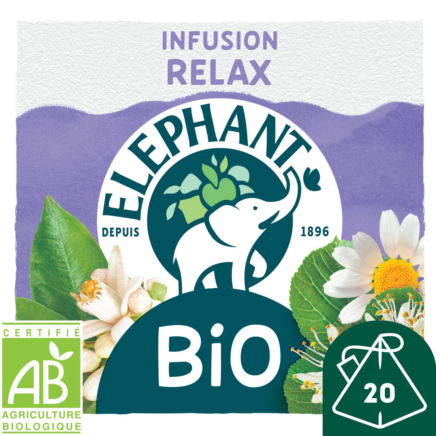 Restez zen et découvrez tout en douceur ce mélange de fleur de camomille, reconnue pour ses vertus apaisantes, de tilleul aux notes légèrement mielleuses et de feuilles d'oranger à la saveur si délicate grâce à l'infusion Bio Relax et ses 20 Sachets Pyramid®. Cette infusion vous offre tout son goût et ses bienfaits. C'est notre façon à nous d'infuser joie et bonne humeur. Le secret de notre infusion ? 100% de ses ingrédients sont d'origine naturelle. Rien que pour vous, Eléphant a soigneusement sélectionné des plantes issues de l'agriculture biologique pour vous proposer cette gamme Bio, pleine de goût. Pour une dégustation idéale, laissez infuser votre sachet d'infusion Pyramid® 4-5 minutes dans 200 ml d'eau chaude et dégustez. L'aventure Eléphant commence en 1896 et se poursuit encore aujourd'hui. Ce qui, de mémoire d'éléphant, fait une sacrée expérience pour un créateur d'infusions... Son plus grand plaisir, depuis toujours, est d'agiter nos papilles ! Eléphant fait de l'écoute de la nature une vraie force, qu'il utilise pour choisir le meilleur des plantes, des fruits et des épices et concocter de délicieuses infusions uniques et appréciées de tous. Mais ne vous y trompez pas, Eléphant*, marque préférée des Français, dans sa grande générosité, y ajoute aussi bienveillance, simplicité, une pointe d'humour et un brin d'originalité. Alors, rejoignez la tribu et découvrez toutes les autres délicieuses recettes de notre gamme Bio.*Eléphant, leader valeur & volume en France — Nielsen année 2022