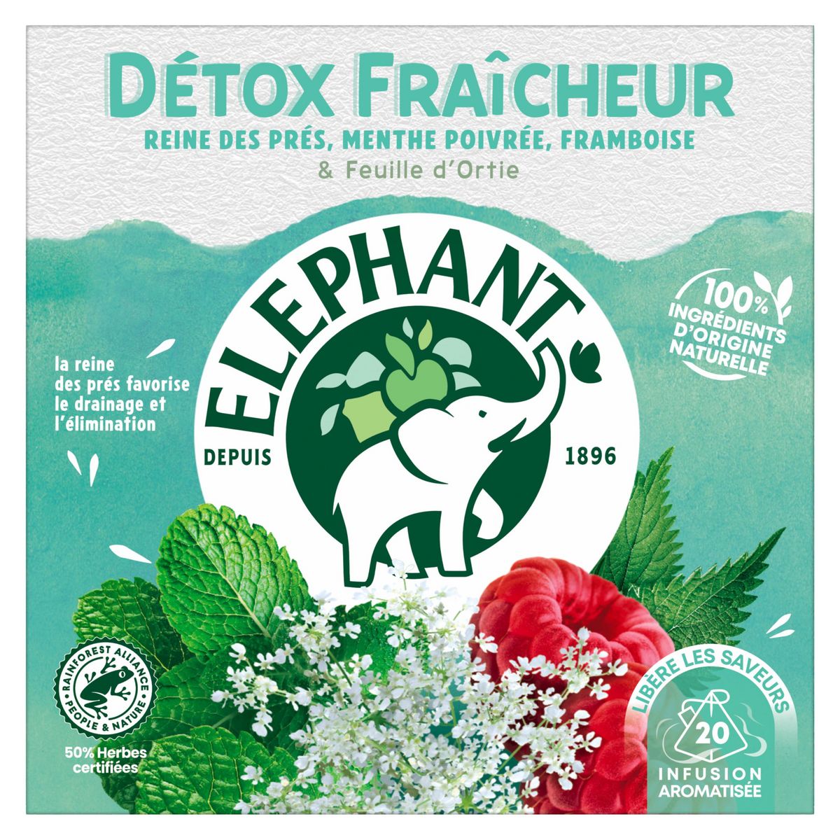 Avec l'infusion Détox Fraîcheur et ses 20 Sachets Pyramid®, faites-vous un pur plaisir et découvrez le goût délicat de la reine-des-prés (tiges et feuilles), reconnue pour ses vertus drainantes, se mariant parfaitement à la fraîcheur épicée de la menthe poivrée ainsi qu'aux notes fruitées de la framboise. En sélectionnant des herbes certifiées Rainforest Alliance, Eléphant veut prendre soin de la planète et contribuer chaque jour à un monde meilleur pour l'humain et la nature. C'est notre façon à nous d'infuser joie et bonne humeur. Le secret de notre infusion ? 100% de ses ingrédients sont d'origine naturelle. Rien que pour vous, Eléphant a soigneusement sélectionné des plantes pour vous proposer cette gamme Bien-Etre. Pour une dégustation idéale, laissez infuser votre sachet d'infusion Pyramid® 4-5 minutes dans 200 ml d'eau chaude et dégustez. L'aventure Eléphant commence en 1896 et se poursuit encore aujourd'hui. Ce qui, de mémoire d'éléphant, fait une sacrée expérience pour un créateur d'infusions... Son plus grand plaisir, depuis toujours, est d'agiter nos papilles ! Eléphant fait de l'écoute de la nature une vraie force, qu'il utilise pour choisir le meilleur des plantes et concocter de délicieuses infusions uniques et appréciées de tous. Mais ne vous y trompez pas, Eléphant*, marque préférée des Français, dans sa grande générosité, y ajoute aussi bienveillance, simplicité, une pointe d'humour et un brin d'originalité. Alors, rejoignez la tribu et découvrez toutes les autres délicieuses recettes de notre gamme Bien-Etre. *Eléphant, leader valeur & volume en France — Nielsen année 2022