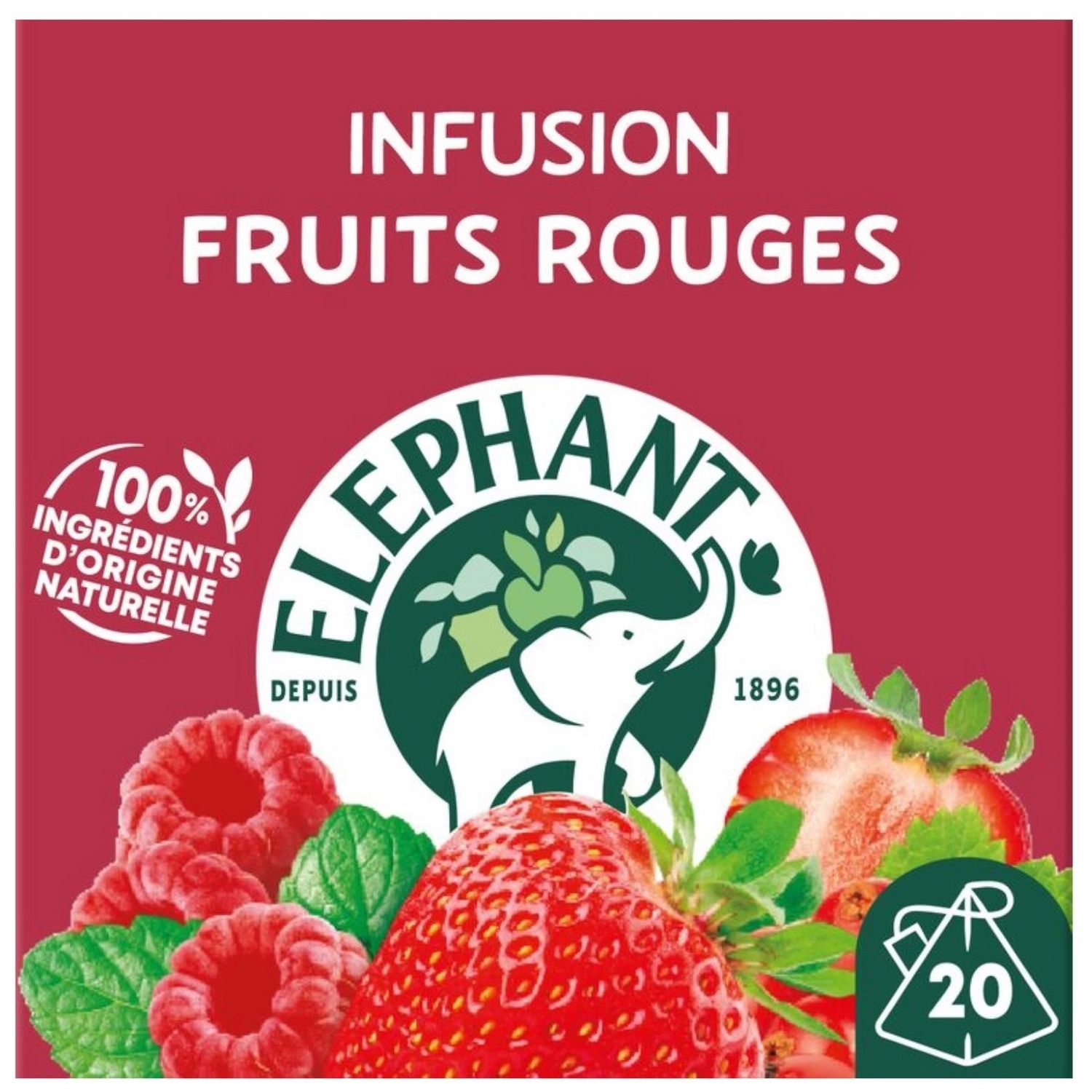 Laissez-vous cueillir par les notes intenses et fruitées de la fraise et de la framboise associées au goût acidulé de la groseille grâce à l'infusion Fruits Rouges et ses 20 Sachets Pyramid®. Le mariage parfait de trois fruits rouges, couronné de la fraîcheur d'une touche de menthe. En sélectionnant des herbes certifiées Rainforest Alliance, Eléphant veut prendre soin de la planète et contribuer chaque jour à un monde meilleur pour l'humain et la nature. C'est notre façon à nous d'infuser joie et bonne humeur. Le secret de notre infusion ? 100% de ses ingrédients sont d'origine naturelle. Rien que pour vous, Eléphant a soigneusement sélectionné des plantes et fruits pour vous proposer cette gamme Fruitée au goût généreux. Pour une dégustation idéale, laissez infuser votre sachet d'infusion Pyramid® 4-5 minutes dans 200 ml d'eau chaude et dégustez. L'aventure Eléphant commence en 1896 et se poursuit encore aujourd'hui. Ce qui, de mémoire d'éléphant, fait une sacrée expérience pour un créateur d'infusions... Son plus grand plaisir, depuis toujours, est d'agiter nos papilles ! Eléphant fait de l'écoute de la nature une vraie force, qu'il utilise pour choisir le meilleur des plantes et des fruits et concocter de délicieuses infusions uniques et appréciées de tous. Mais ne vous y trompez pas, Eléphant*, marque préférée des Français, dans sa grande générosité, y ajoute aussi bienveillance, simplicité, une pointe d'humour et un brin d'originalité. Alors, rejoignez la tribu et découvrez toutes les autres délicieuses recettes de notre gamme Fruitée. *Eléphant, leader valeur & volume en France — Nielsen année 2022