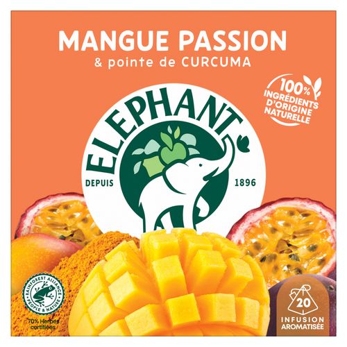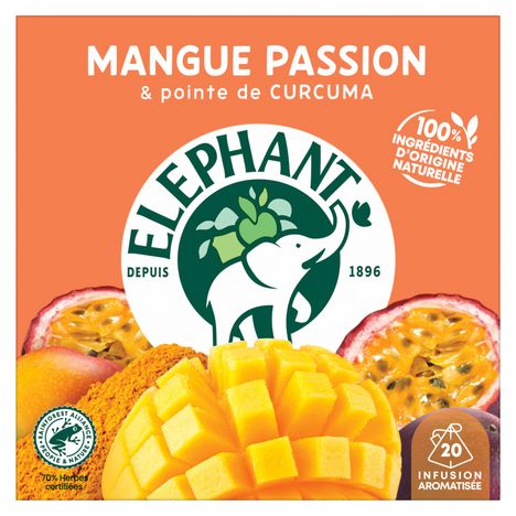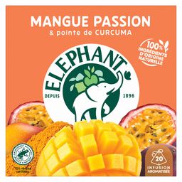 Mettez le cap sur les tropiques en retrouvant le goût exotique si fruité de la mangue et celui délicieusement acidulé du fruit de la passion grâce à l'infusion Mangue Passion et ses 20 Sachets Pyramid®. Une rencontre sublimée par les notes chaudes d'une pointe de curcuma. En sélectionnant des herbes certifiées Rainforest Alliance, Eléphant veut prendre soin de la planète et contribuer chaque jour à un monde meilleur pour l'humain et la nature. C'est notre façon à nous d'infuser joie et bonne humeur. Le secret de notre infusion ? 100% de ses ingrédients sont d'origine naturelle. Rien que pour vous, Eléphant a soigneusement sélectionné des plantes et fruits pour vous proposer cette gamme Fruitée au goût généreux. Pour une dégustation idéale, laissez infuser votre sachet d'infusion Pyramid® 4-5 minutes dans 200 ml d'eau chaude et dégustez. L'aventure Eléphant commence en 1896 et se poursuit encore aujourd'hui. Ce qui, de mémoire d'éléphant, fait une sacrée expérience pour un créateur d'infusions... Son plus grand plaisir, depuis toujours, est d'agiter nos papilles ! Eléphant fait de l'écoute de la nature une vraie force, qu'il utilise pour choisir le meilleur des plantes, des fruits et des épices et concocter de délicieuses infusions uniques et appréciées de tous. Mais ne vous y trompez pas, Eléphant*, marque préférée des Français, dans sa grande générosité, y ajoute aussi bienveillance, simplicité, une pointe d'humour et un brin d'originalité. Alors, rejoignez la tribu et découvrez toutes les autres délicieuses recettes de notre gamme Fruitée. *Eléphant, leader valeur & volume en France — Nielsen année 2022
