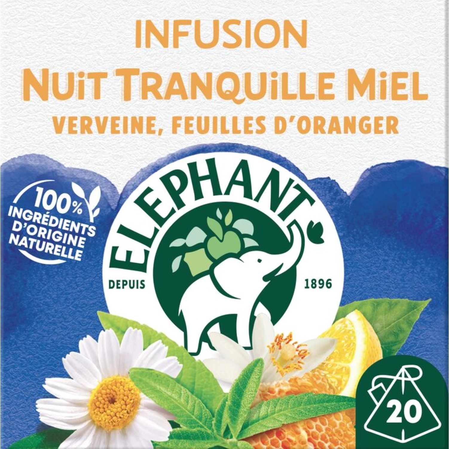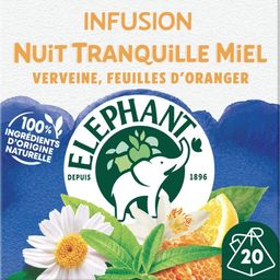 Avec l'infusion Nuit Tranquille Miel Citron et ses 20 Sachets Pyramid®, faites de beaux rêves et découvrez le goût rond des feuilles d'oranger associé aux notes citronnées de la feuille de verveine, reconnue pour ses vertus apaisantes, et de la camomille. Le tout relevé par la douceur du Miel et du Citron. En sélectionnant des herbes certifiées Rainforest Alliance, Eléphant veut prendre soin de la planète et contribuer chaque jour à un monde meilleur pour l'humain et la nature. C'est notre façon à nous d'infuser joie et bonne humeur. Le secret de notre infusion ? 100% de ses ingrédients sont d'origine naturelle. Rien que pour vous, Eléphant a soigneusement sélectionné des plantes pour vous proposer cette gamme Bien-Etre. Pour une dégustation idéale, laissez infuser votre sachet d'infusion Pyramid® 4-5 minutes dans 200 ml d'eau chaude et dégustez. L'aventure Eléphant commence en 1896 et se poursuit encore aujourd'hui. Ce qui, de mémoire d'éléphant, fait une sacrée expérience pour un créateur d'infusions... Son plus grand plaisir, depuis toujours, est d'agiter nos papilles ! Eléphant fait de l'écoute de la nature une vraie force, qu'il utilise pour choisir le meilleur des plantes et concocter de délicieuses infusions uniques et appréciées de tous. Mais ne vous y trompez pas, Eléphant*, marque préférée des Français, dans sa grande générosité, y ajoute aussi bienveillance, simplicité, une pointe d'humour et un brin d'originalité. Alors, rejoignez la tribu et découvrez toutes les autres délicieuses recettes de notre gamme Bien-Etre. *Eléphant, leader valeur & volume en France — Nielsen année 2022