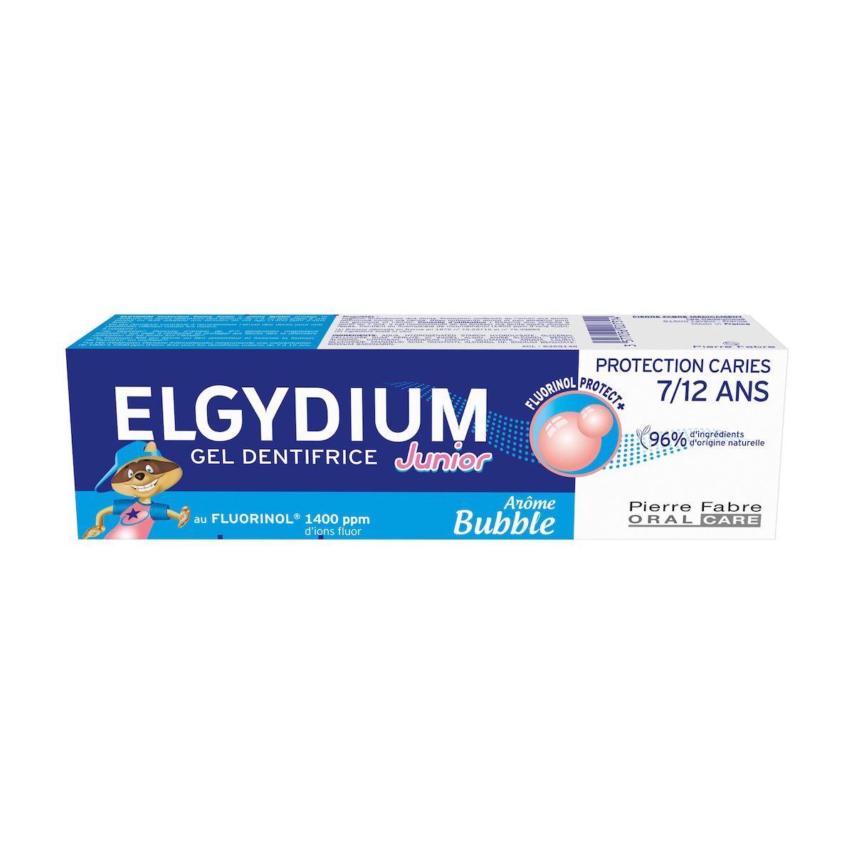 Le complexe Fluorinol® Protect+™ contenu dans ELGYDIUM Junior Bubble 7/12 ans - dentifrice enfant a une teneur en fluor adaptée aux besoins de cet âge (1400ppm d'ions fluor) et offre une protection renforcée de l'émail des dents définitives contre le