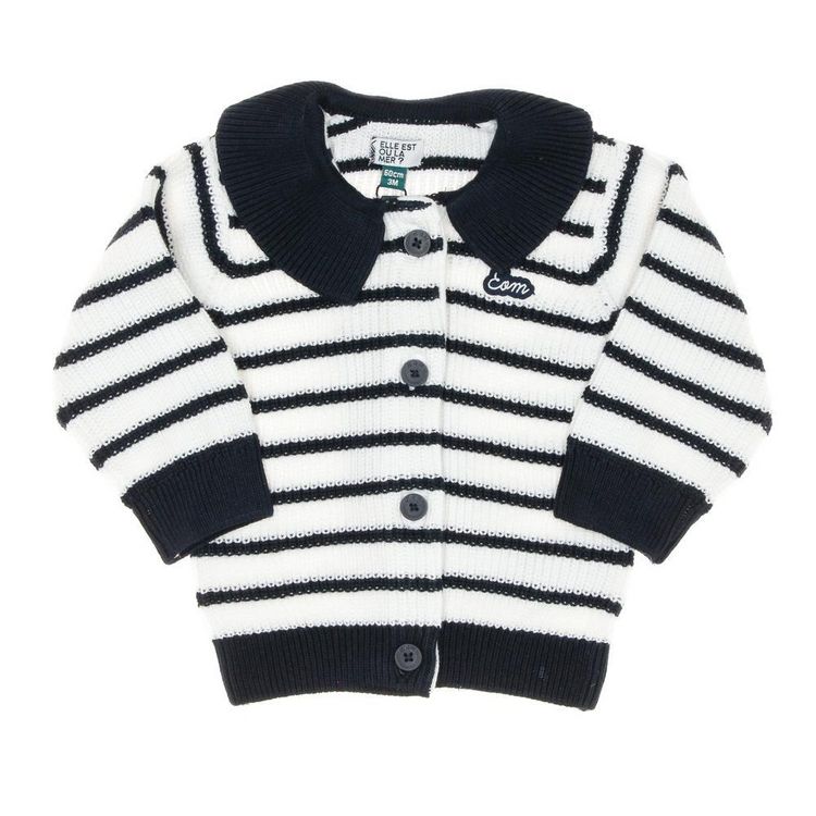 Craquez pour le gilet fille Elle est ou la mer !Manches longuesFermeture à boutonsCol claudineMarinièreMailleColoris : Blanc/BleuComposition : 100% coton