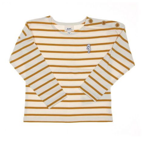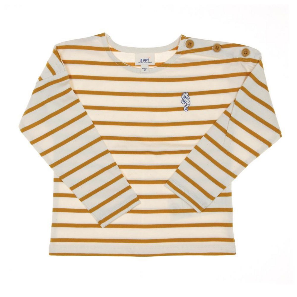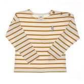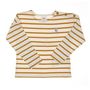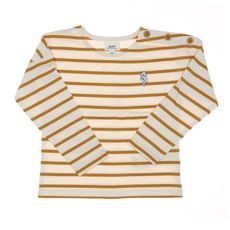 Craquez pour le t-shirt enfant de la marque Elle est ou la mer !Manches longuesCol rondDessin brodéColoris : Jaune/BeigeRayures2 boutons sur l'épauleComposition : 100% coton
