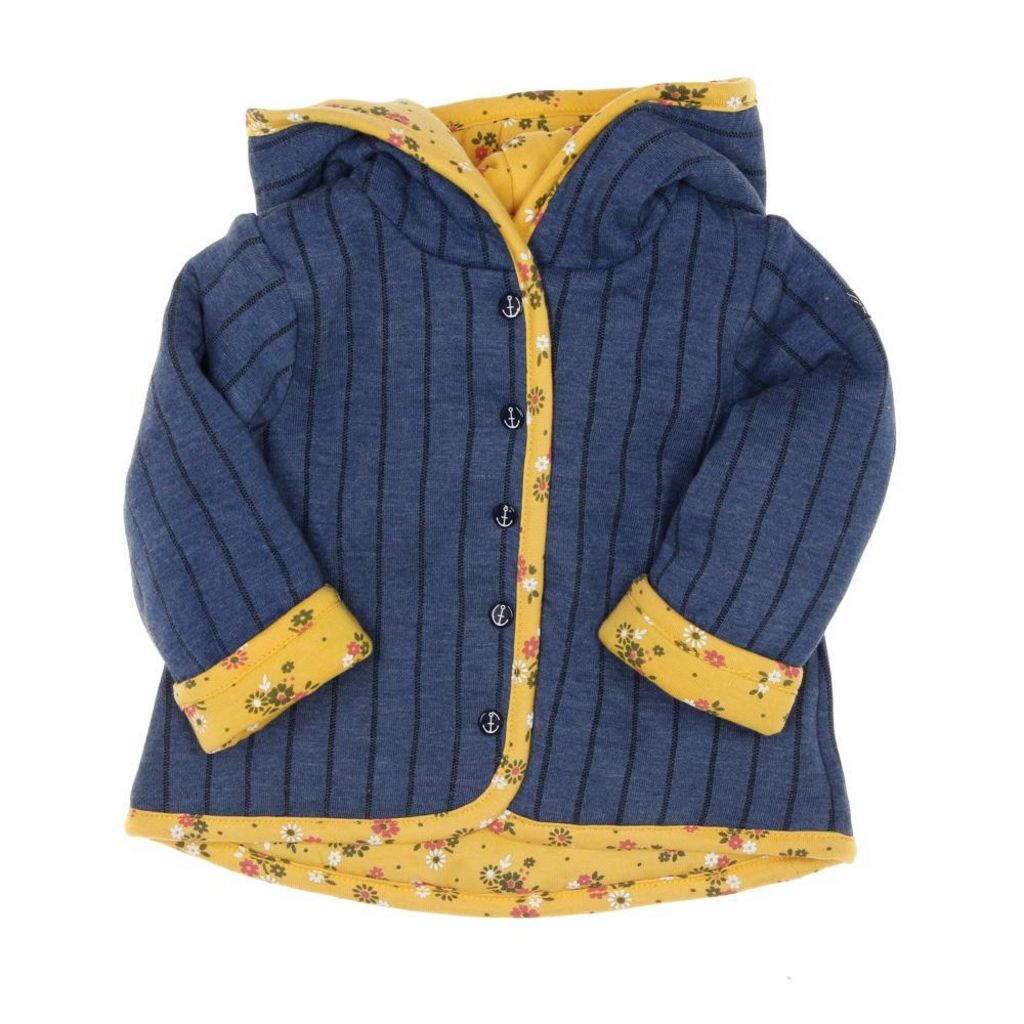 Optez vite pour la veste fille Elle est ou la mer !Manches longuesCapucheRéversibleColoris : Marine/Jaune à fleursFermeture à boutons pressionsComposition : 77% polyester , 23% coton
