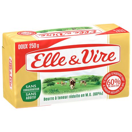 La Plaquette 60% d'Elle & Vire est un beurre à teneur réduite en matière grasse (60%) fabriqué à Condé-sur-Vire. Cette plaquette apporte tout le plaisir du beurre avec moins de matière grasse. Il s'utilise aussi bien en tartine qu'en cuisine.