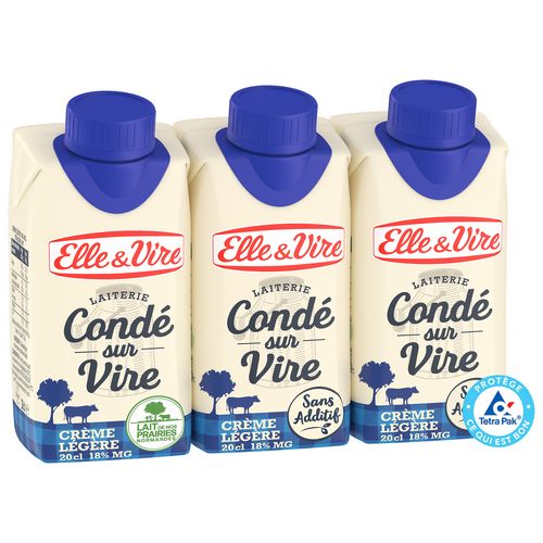 La crème légère de Condé-sur-Vire c'est de la vraie crème normande allégée avec un peu de lait, sans aucun additif. Une crème légère dont la texture est ainsi naturellement liquide.