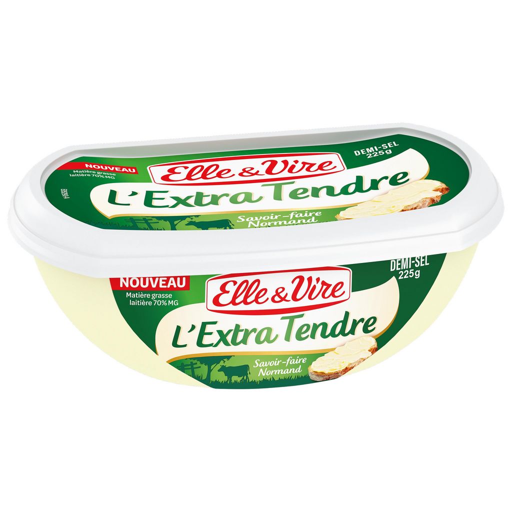 L'Extra Tendre Elle & Vire, c'est la promesse d'une recette encore plus facile à tartiner dès la sortie du réfrigérateur. Sa texture fondante et son bon goût frais en feront votre allié au quotidien. Il s'utilise parfaitement en tartine, en cuisson et en pâtisserie, pour le plaisir de toute la famille !