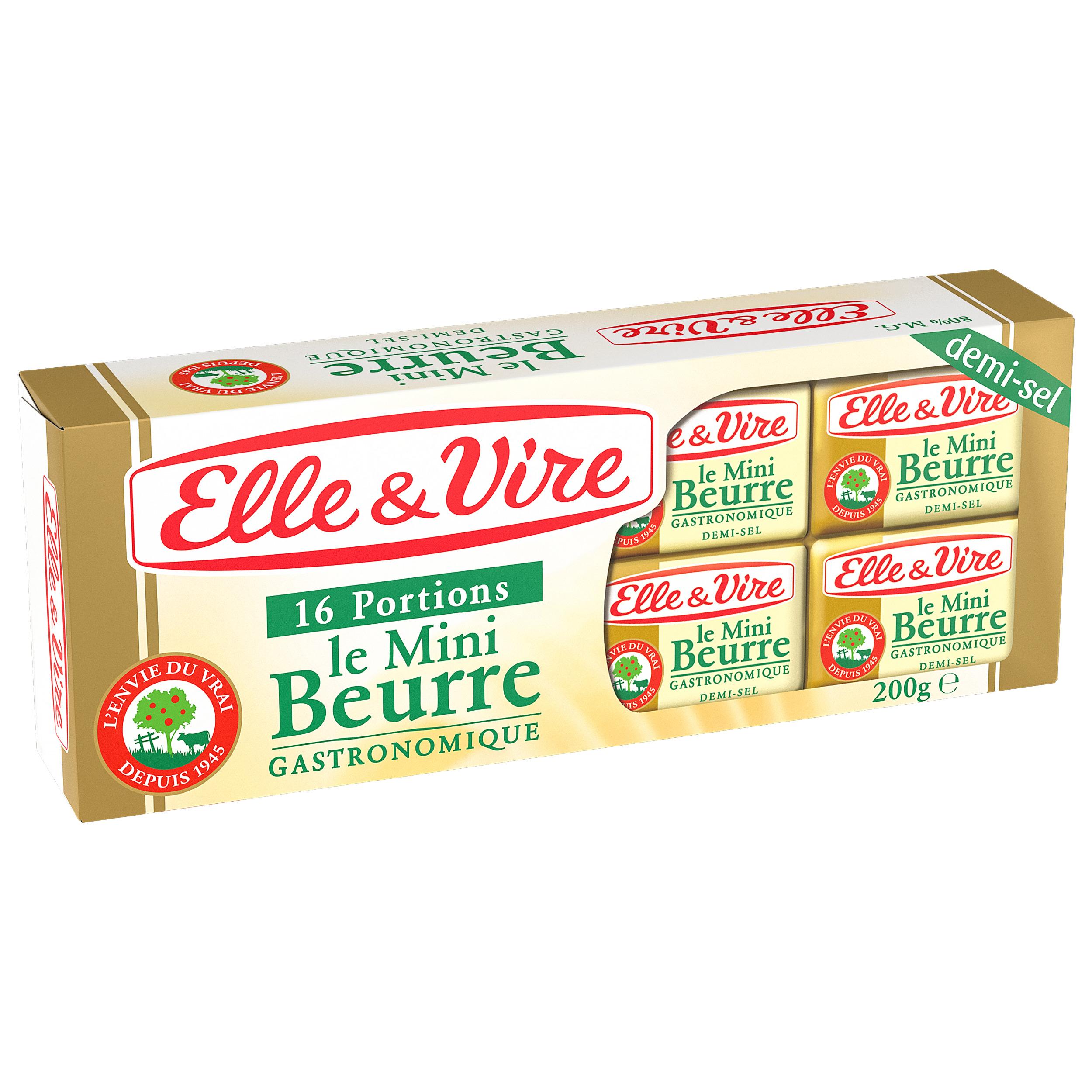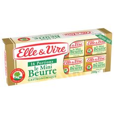 Depuis 1945 nos maîtres beurriers Elle & Vire utilisent tout leur savoir-faire normand pour vous offrir du bon beurre au goût frais. Avec leur format individuel, les Mini-Beurres Gastronomiques Elle & Vire sont pratiques, idéals pour une présentation élégante à table et assurent une conservation optimale.