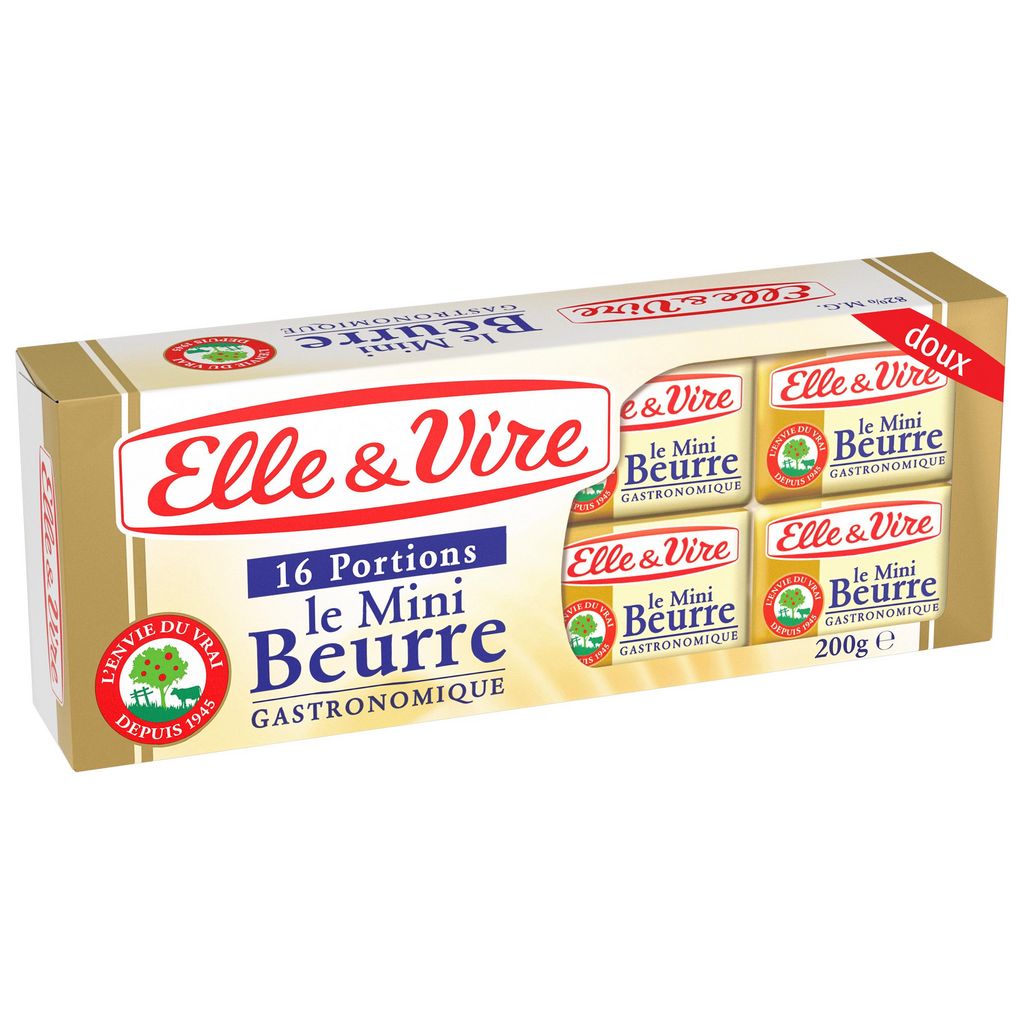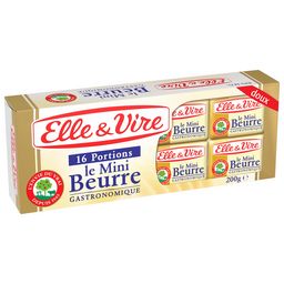 Depuis 1945 nos maîtres beurriers Elle & Vire utilisent tout leur savoir-faire normand pour vous offrir du bon beurre au goût frais. Avec leur format individuel, les Mini-Beurres Gastronomiques Elle & Vire sont pratiques, idéals pour une présentation élégante à table et assurent une conservation optimale.