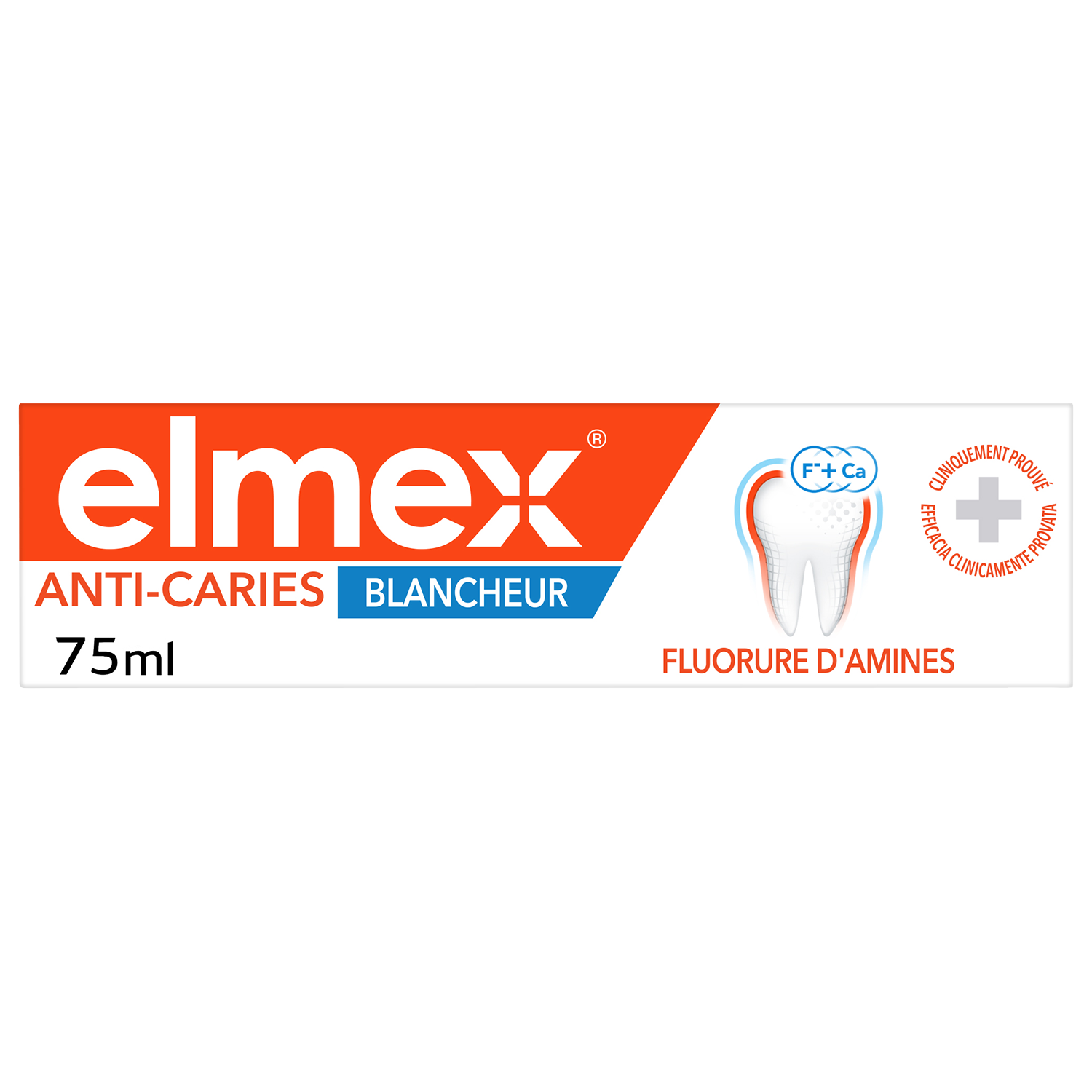 Le dentifrice elmex® Anti-Caries reminéralise, aide à protéger contre les caries . La formule elmex® hautement efficace à base de flurorure d'amines Olafluor forme un bouclier bi-actif calcium-fluorure qui reminéralise et aide à protèger contre les caries.