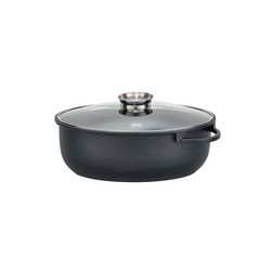 - COMPOSITION: Fonte d'aluminium moulée noire, avec poignées intégrées, revêtement antiadhésif ELODUR® Select , couvercle en verre, cerclé d'acier inoxydable protégeant des chocs