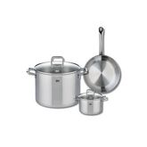 Découvrez l'ensemble de cuisine Elo Profi Citrin, une batterie de cuisine composée d'une poêle de cuisson de 24 cm et de deux faitouts de 14 et 26 cm. Conçue en inox robuste, cette collection offre une qualité de cuisson exceptionnelle, idéale pour les passionnés de gastronomie.