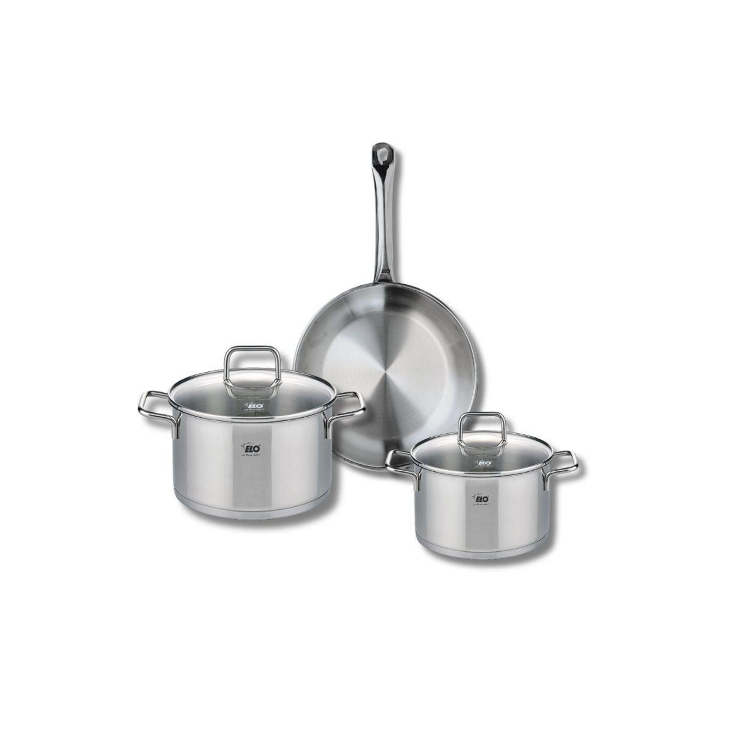 Découvrez l'ensemble de cuisine Elo Profi Citrin, composé d'une poêle de cuisson de 24 cm et de deux faitouts de 16 et 20 cm. Conçus en inox de haute qualité, ces ustensiles sont parfaits pour une cuisson saine et efficace. Grâce à leur conception robuste, ils garantissent une excellente répartition