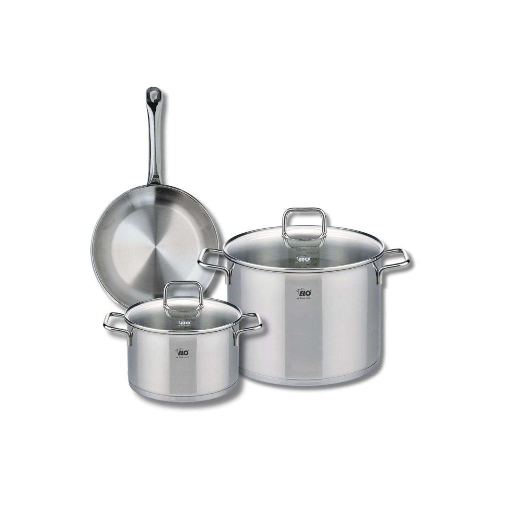 Découvrez l'ensemble de cuisine Elo Profi Citrin, comprenant une poêle de cuisson de 24 cm et deux faitouts de 20 et 26 cm. Conçus en inox de haute qualité, ces ustensiles allient robustesse et performance pour vous accompagner dans toutes vos préparations culinaires.