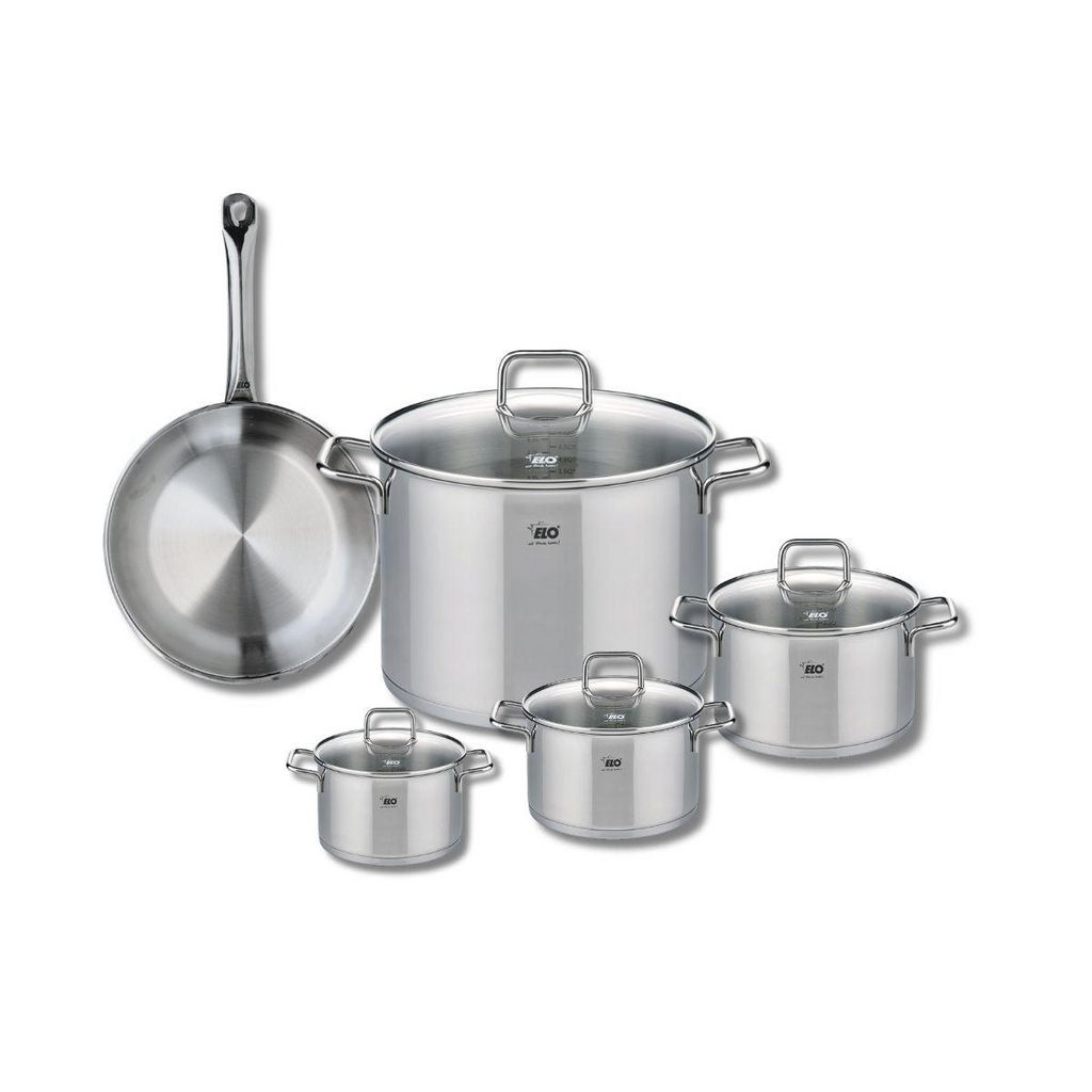 Découvrez l'ensemble de cuisine Elo Profi Citrin, une batterie de cuisine en inox alliant robustesse et performance. Cet ensemble comprend une poêle de cuisson de 24 cm et quatre faitouts de tailles variées : 12, 14, 16 et 26 cm. Parfait pour répondre à tous vos besoins culinaires, cet ensemble est