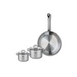 Découvrez l'ensemble de cuisine Elo Profi Citrin, une batterie de cuisine composée d'une poêle de cuisson de 28 cm et de deux faitouts de 12 et 14 cm. Fabriqués en inox de haute qualité, ces ustensiles sont conçus pour répondre aux besoins des chefs amateurs et professionnels.