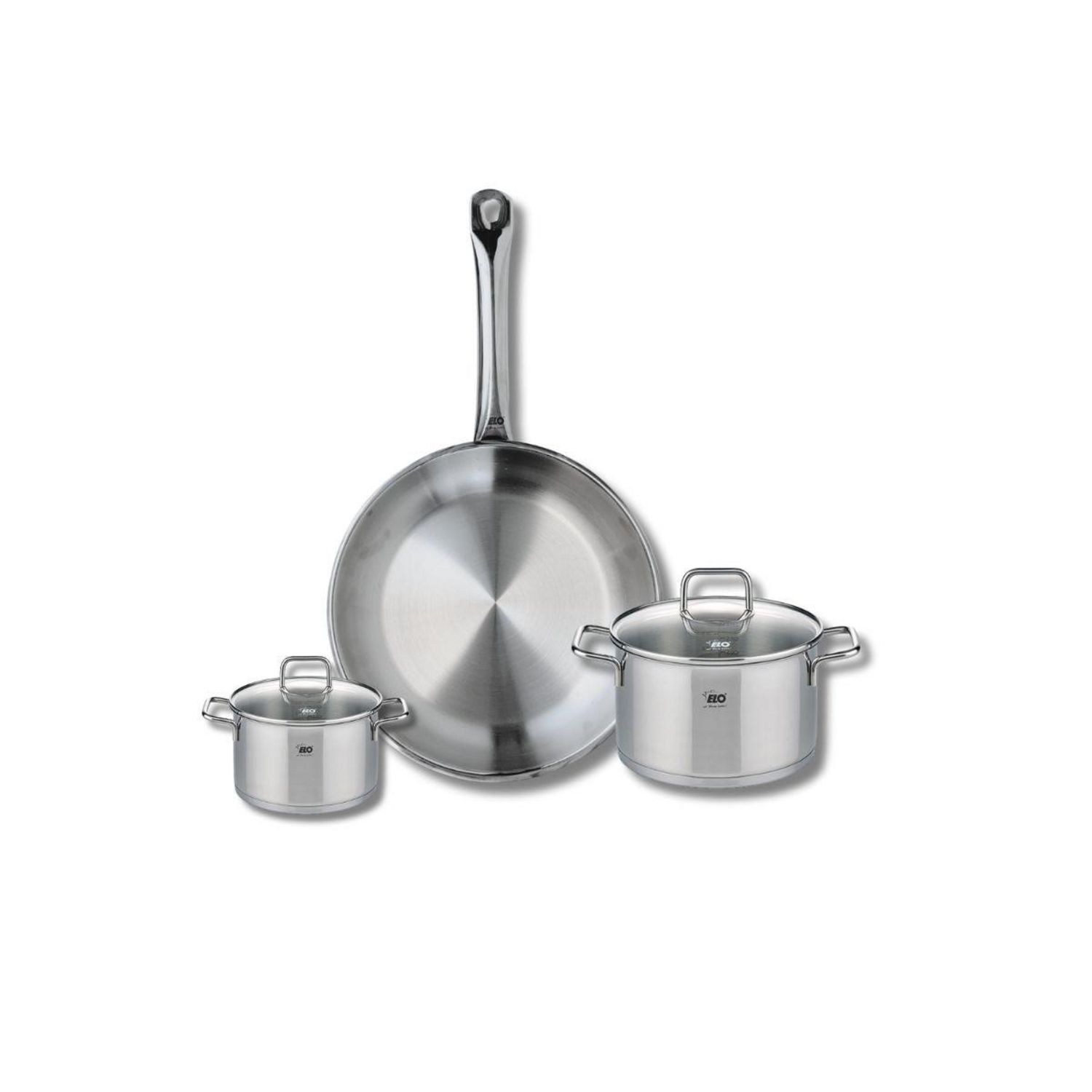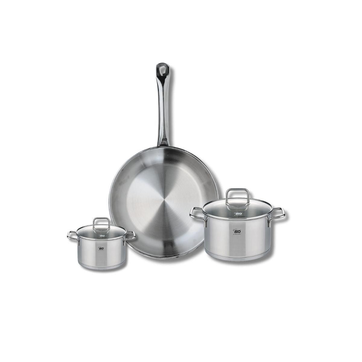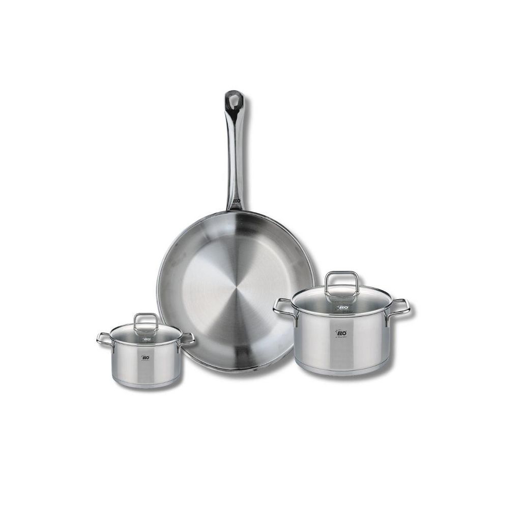 Découvrez l'ensemble de cuisine Elo Profi Citrin, une batterie de cuisine composée d'une poêle de cuisson de 28 cm et de deux faitouts de 12 et 16 cm. Conçus en inox robuste, ces ustensiles vous garantissent une excellente conductivité thermique et une répartition uniforme de la chaleur, rendant vos préparations culinaires encore plus savoureuses.