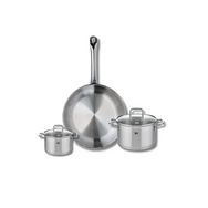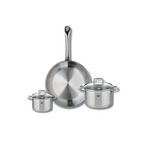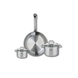 Découvrez l'ensemble de cuisine Elo Profi Citrin, une batterie de cuisine composée d'une poêle de cuisson de 28 cm et de deux faitouts de 12 et 16 cm. Conçus en inox robuste, ces ustensiles vous garantissent une excellente conductivité thermique et une répartition uniforme de la chaleur, rendant vos