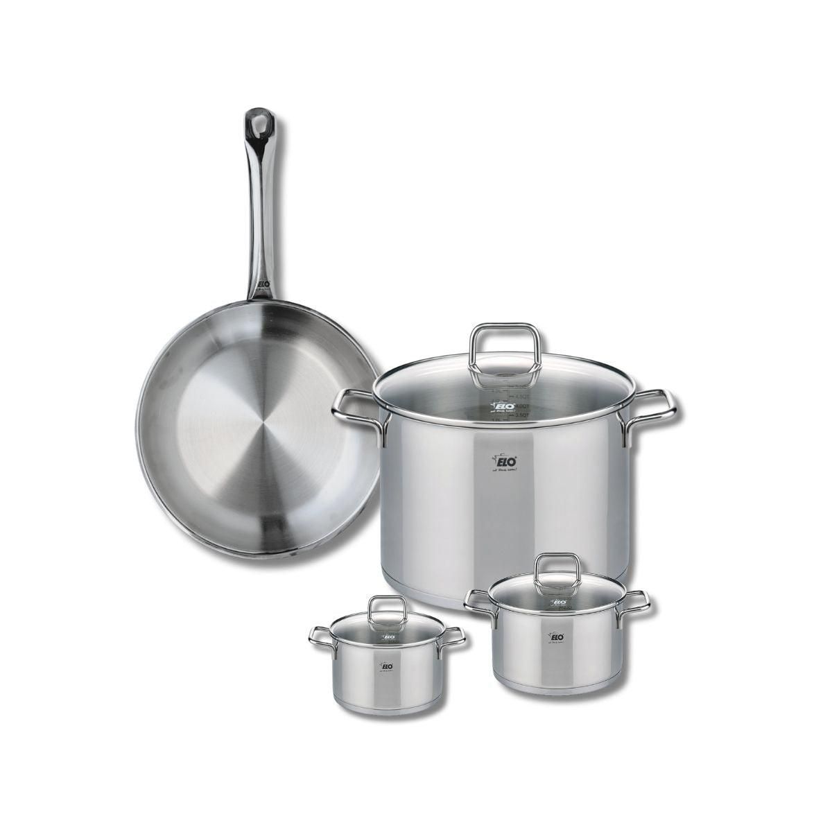 Découvrez l'ensemble de cuisson Elo Profi Citrin, une batterie de cuisine composée d'une poêle de 28 cm et de trois faitouts de 12, 14 et 26 cm. Conçue en inox de haute qualité, cette collection garantit une robustesse exceptionnelle et une excellente conductivité thermique, idéale pour une cuisson