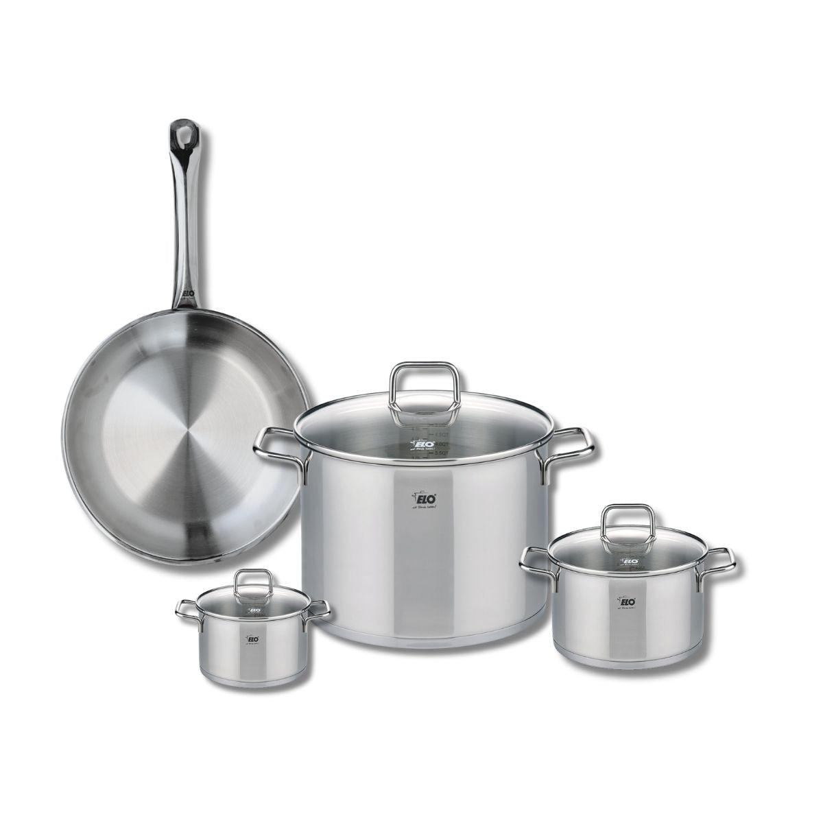 Découvrez l'ensemble de cuisine Elo Profi Citrin, comprenant une poêle de cuisson de 28 cm et trois faitouts de 12, 16 et 26 cm. Fabriqués en inox de haute qualité, ces ustensiles de cuisine sont conçus pour répondre à tous vos besoins culinaires. Grâce à leur matériau robuste, ces produits garantis