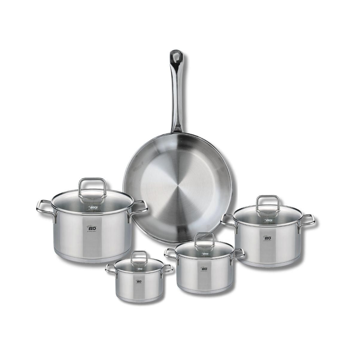Découvrez l'ensemble de cuisson Elo Profi Citrin, une batterie de cuisine de 9 pièces qui allie fonctionnalité et élégance. Composé d'une poêle de cuisson de 28 cm et de quatre faitouts de 12, 14, 16 et 20 cm, cet ensemble est idéal pour tous vos besoins culinaires, qu'il s'agisse de faire sauter, m