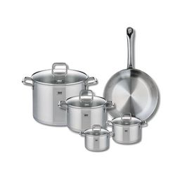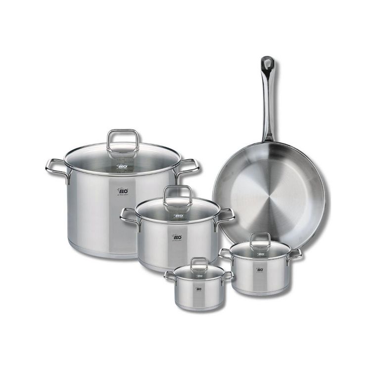 Découvrez l'ensemble de cuisson Elo Profi Citrin, une batterie de cuisine polyvalente et robuste, idéale pour tous vos besoins culinaires. Ce lot comprend une poêle de cuisson de 28 cm et quatre faitouts de différentes tailles : 12, 14, 20 et 26 cm. Fabriqués en inox de haute qualité, ces ustensiles
