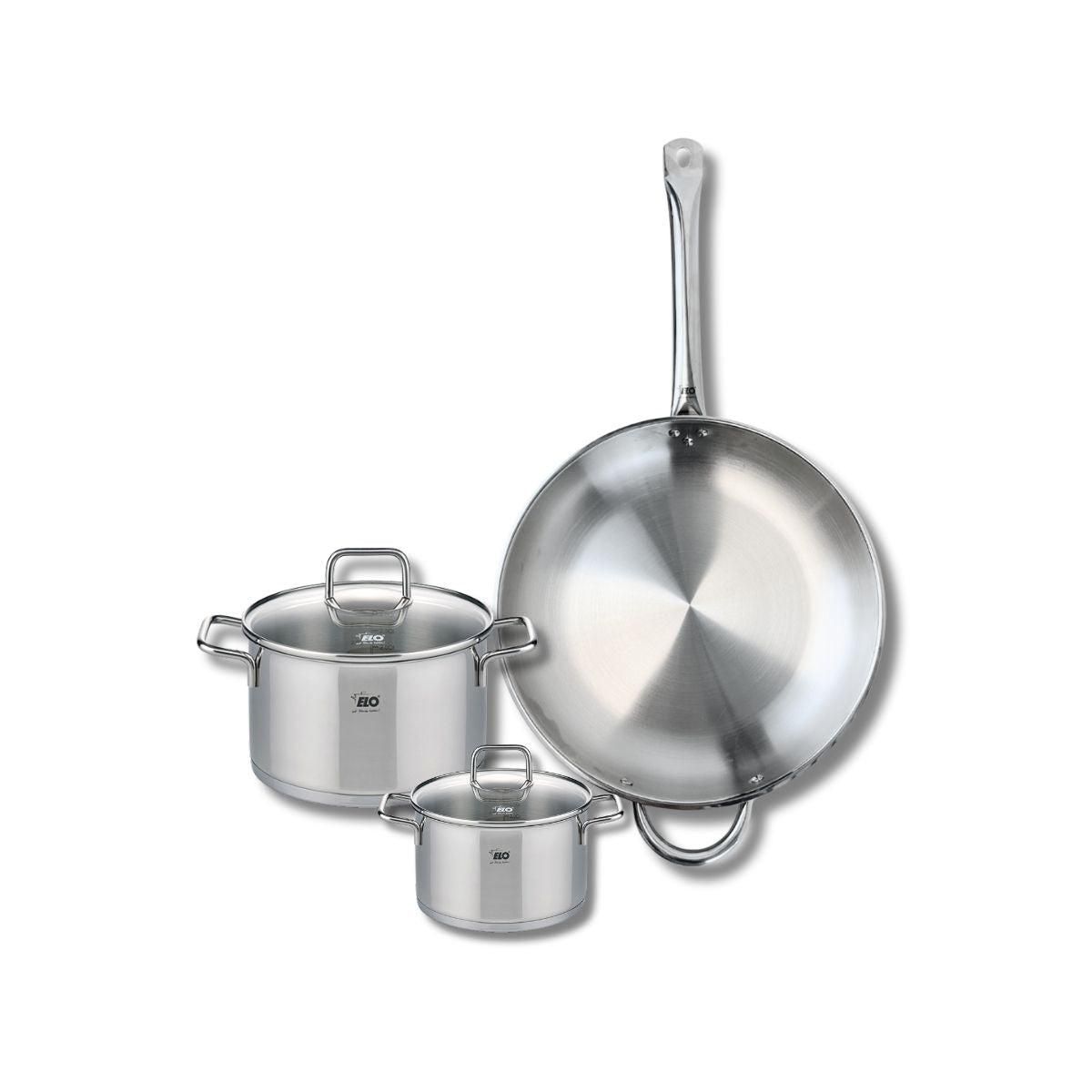 Découvrez l'ensemble de cuisine Elo Profi Citrin, comprenant une poêle de cuisson de 32 cm et deux faitouts de 14 et 20 cm. Fabriqués en inox robuste, ces ustensiles de cuisine sont conçus pour répondre aux besoins des chefs amateurs et professionnels.