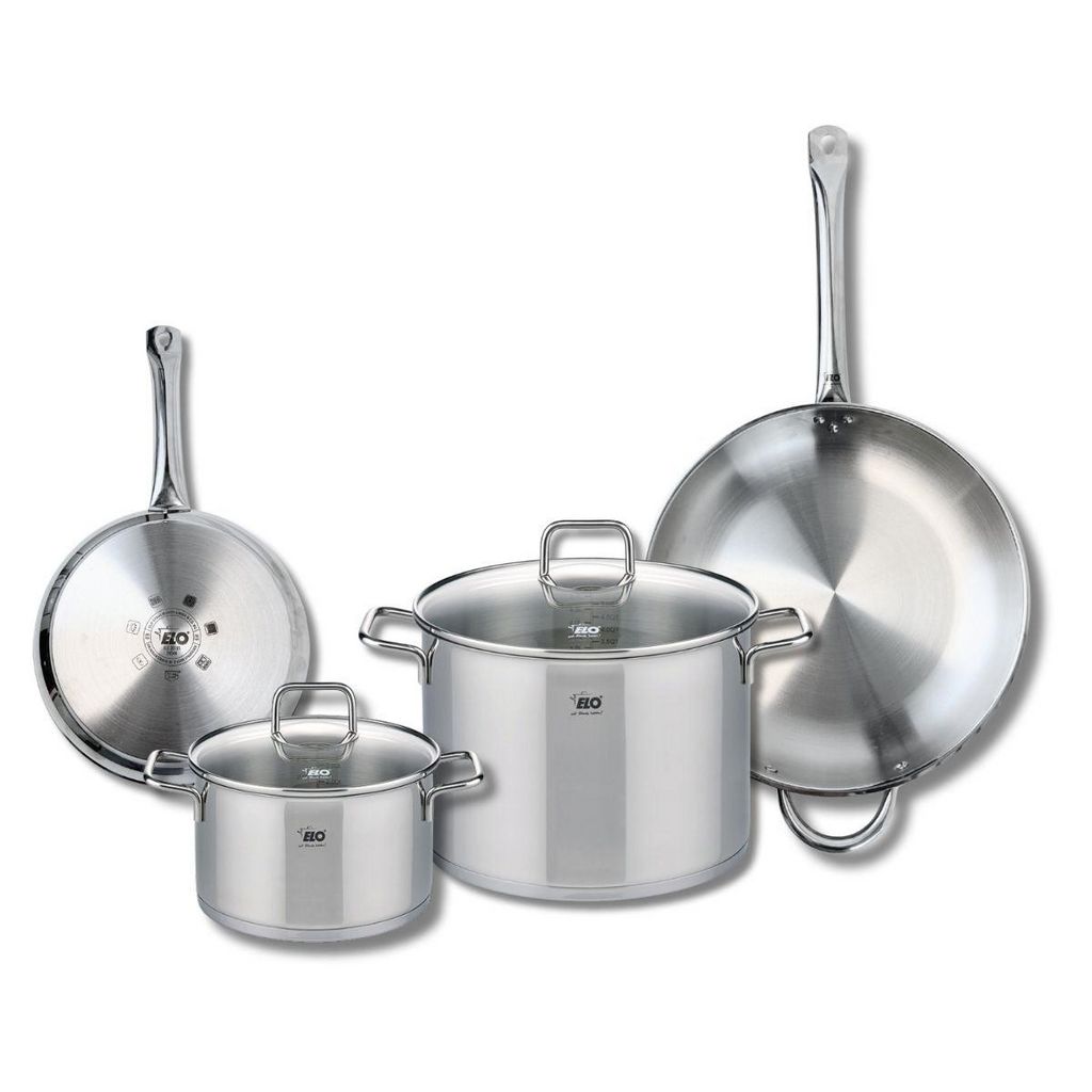 Découvrez l'ensemble de cuisine Elo Profi Citrin, comprenant deux poêles de cuisson de 24 et 32 cm ainsi que deux faitouts de 20 et 26 cm. Conçues en inox de haute qualité, ces pièces allient robustesse et performance pour une cuisson optimale. Grâce à leur conception sans revêtement et l'absence de
